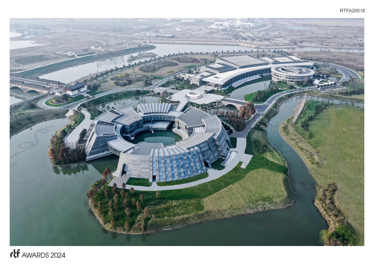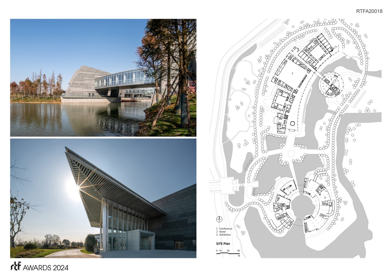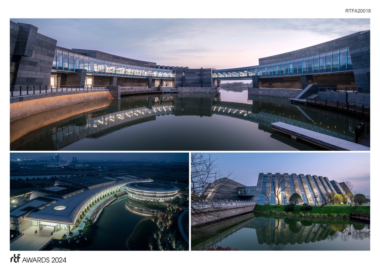 The international cultural exchange center serves three major functions: an exhibition center, a conference hall and an auxiliary hotel. The site is divided into northern and southern parts, and shares the same entrance avenue with the wetland park. Surrounded by dense rivers and ponds, the design aims to minimize the construction impact on the environment and to integrate the building mass with the natural context. During the initial phase, efforts were made to preserve the existing water ponds. Smaller or fragmented ponds were connected to form a complete water network, flowing in and out of the architectural volume. This not only creates a harmonious water system but also contributes to the conservation of the natural ecosystem by increasing the unobstructed water area.
