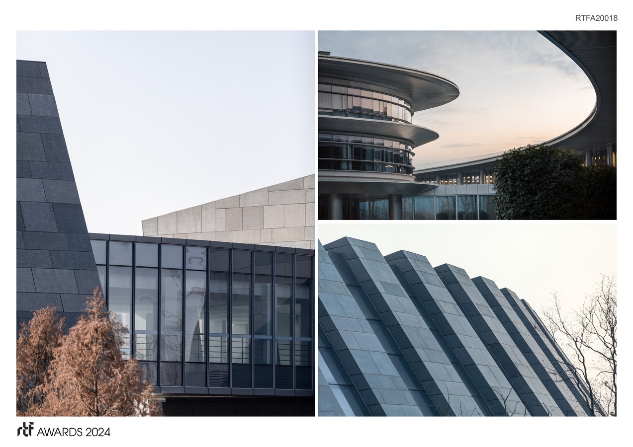 To the north of the entrance, the conference hall accommodates three different scales of conference rooms and accessory facilities. The interconnected spaces are linked together by a circulation belt, which gracefully curve around the circular hotel to its side. Inspired by the beauty of the surrounding rivers, the conference hall incorporates simple forms and cleverly combines the use of stone, glass, and customized aluminum panels to create an architectural language that blends the natural and the contemporary elements. The exhibition center, on the other hand, is composed of arc-shaped masonry blocks that join together to form a ring.