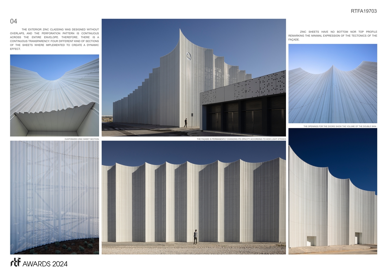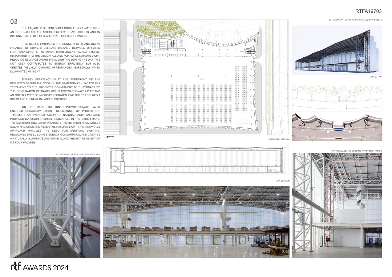 Energy efficiency is at the forefront of the project’s design philosophy. The 20-meter-high facade is a testament to the project’s commitment to sustainability. The combination of translucent polycarbonate layer and an outer layer of micro-perforated zinc sheet ensures a solar and thermal balanced interior.