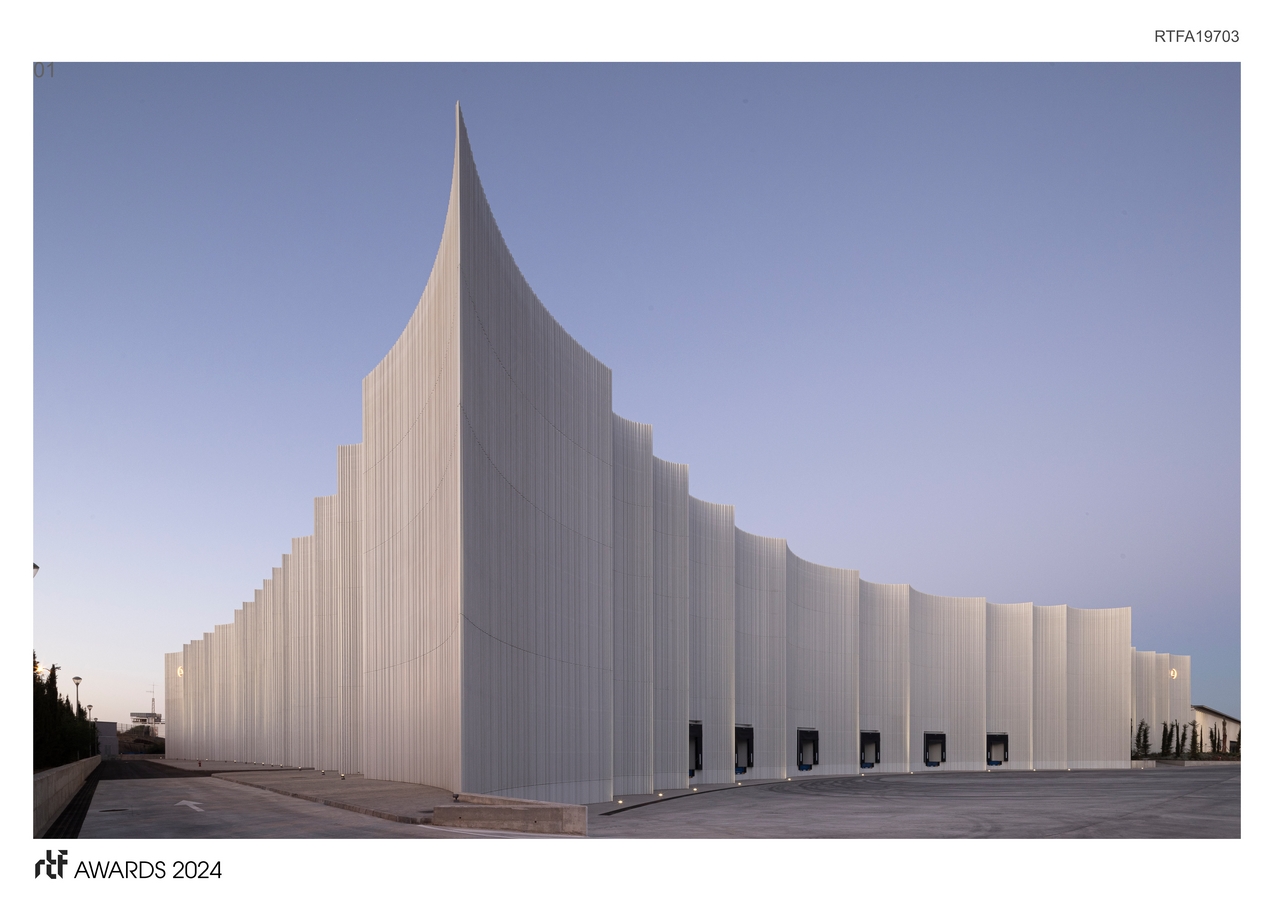 The Mayoral New Warehouse Logistics Center has a massive volume with an area of 18,814 square meters and reaching a towering height of 20 meters. Therefore, to integrate both buildings and soften the significant height difference between the existing warehouse and the new structure, the project embraced two key ideas:
