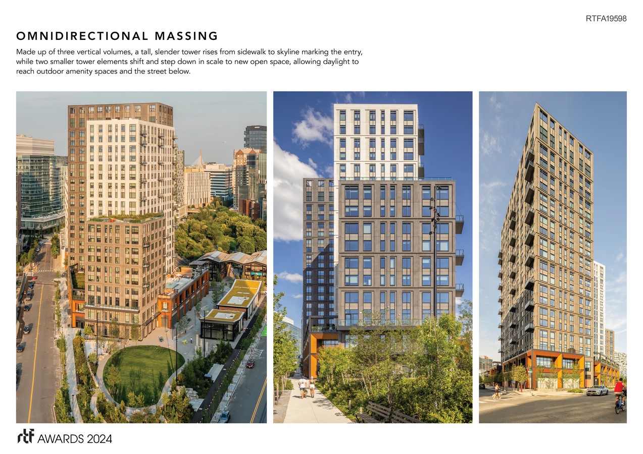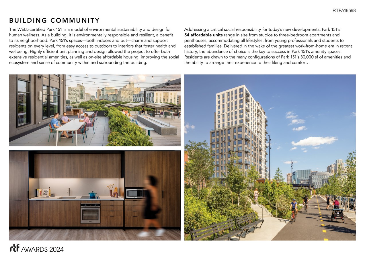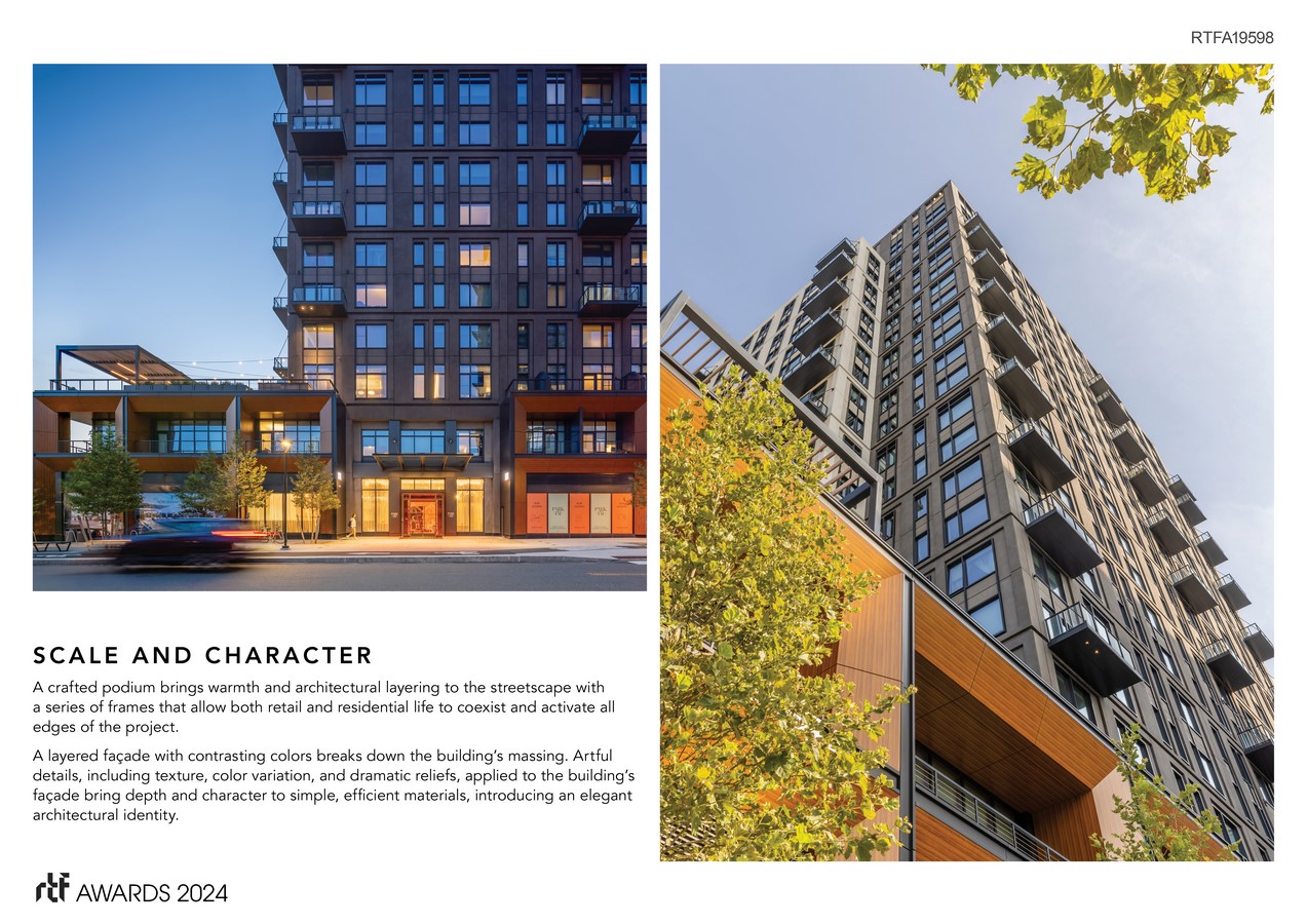 Park 151 is composed of simple building forms arranged in response to varying urban conditions surrounding the site. A tall, slender tower rises from sidewalk to skyline marking the entry, while two smaller forms shift and step down in scale to meet the new open space, allowing daylight to reach outdoor amenity spaces and the street below. A finely crafted podium brings warmth and architectural layering to the streetscape with a series of frames that create space for both retail and residential life to coexist while activating all edges of the project. Thoughtful detailing, the use of texture, relief, and subtle color variation bring life to the building’s cost-effective precast façade.