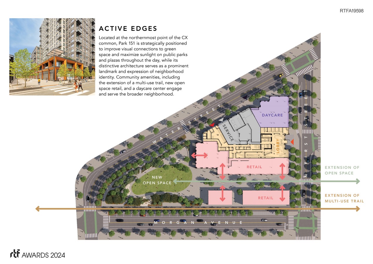 Expanding on the larger CX vision to transform the site of an inaccessible, contaminated railyard into a vibrant, mixed-use community, Park 151 introduces one of the first multifamily residences to the neighborhood and brings with it a collection of retail and new public spaces.