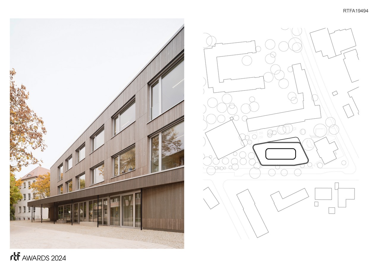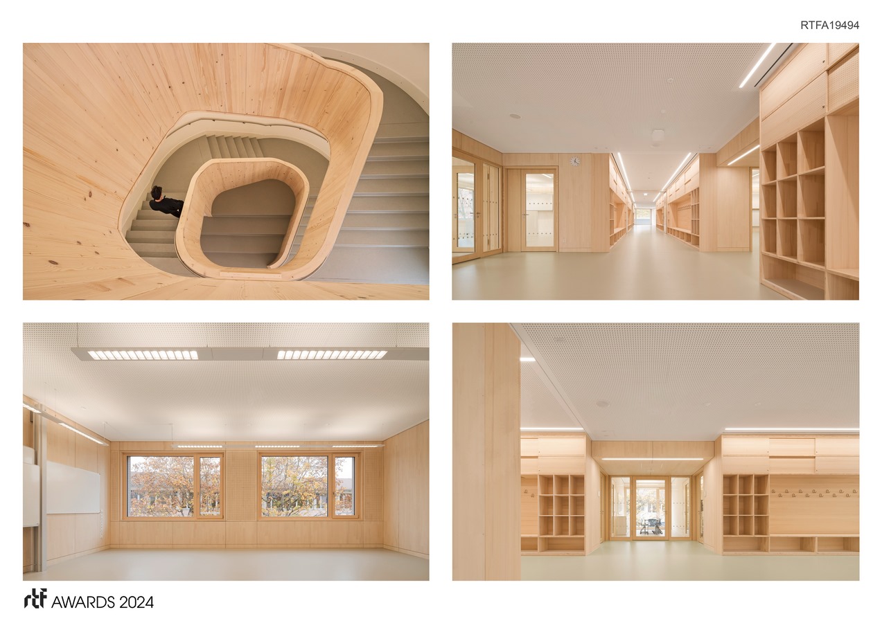 School buildings are places that not only impart knowledge but also strengthen the social fabric and provide space for innovation, creativity and community. Due to increased demand for space and the introduction of an all-day education programme, a third construction stage had become necessary for the Stuttgart-Stammheim primary school. It now provides space for around 400 pupils and 30 teachers – in a geometrically complex, three-storey new building in sustainable timber construction with 17 classrooms. Wood is used here in a sensible and visually tangible way.