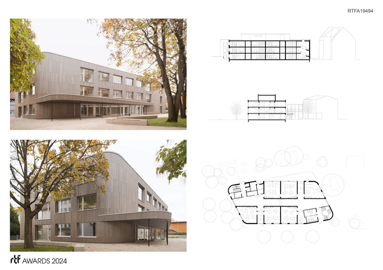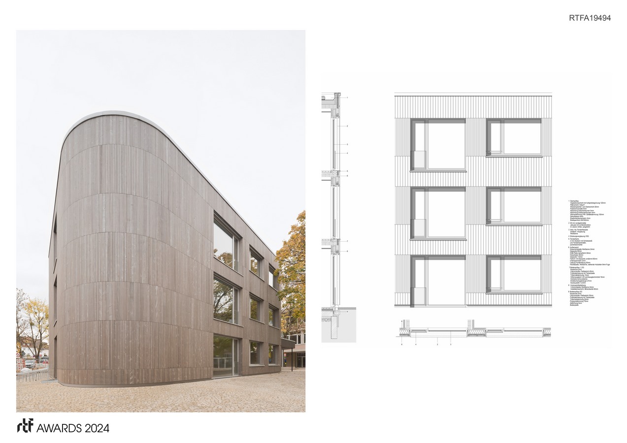 From the outside, the building presents itself as a combination of large glass areas and closed light grey wooden sections made of silver fir. The vertical wood cladding is structured by horizontal segmentation: wide bands alternate with narrow wooden slats and narrow bands alternate with wide wooden slats, creating a dynamic effect that, in the interplay with the different window formats, forms a differentiated façade. The main staircase in the north of the building is a special feature due to its rounded shape. Bright, natural silver fir wood also distinguishes the interior, creating a warm, natural aesthetic.