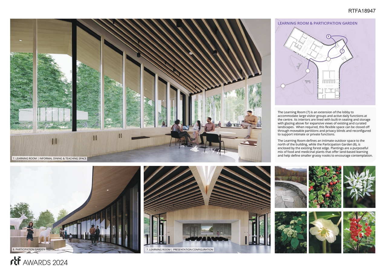 The history of the Rouge has deep ties to Indigenous heritage and includes some of the oldest known Indigenous sites in Canada. The design process included extensive design consultations with the First Nations Advisory Circle (FNAC), comprised of ten Indigenous communities who were historically and/or are currently living in proximity to the RNUP. FNAC expressed a desire for a seamless transition between building and natural elements; “a need to feel feet on the ground and head in the sky”, having the building integrated with the surrounding landscapes.