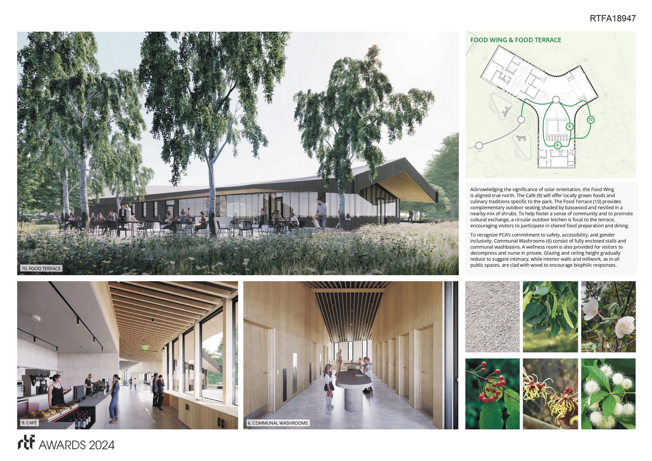 A central theme of restoration was collectively established with PCA to help guide a unified design narrative between building, landscape, and visitor experience. The implementation of this theme is multifaceted; visitors restore and learn of the natural environment, restore and celebrate the many stories of the land, restore and strengthen a sense of community, and ultimately, restore mind, body, and spirit through reflection, movement, and nourishment. Restoration is not focused only on what was, but what will draw inspiration from the past to ignite the future.