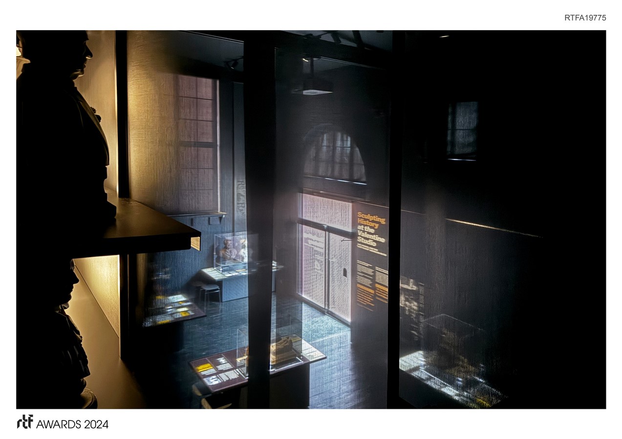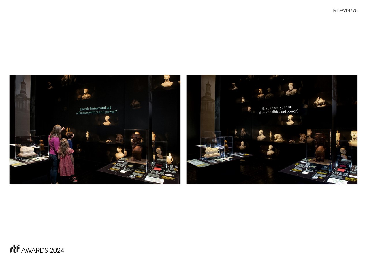 5.ย ย ย ย ย ย ย ย Sculpture Shelf: 86 busts are displayed on seven shelves, reaching a height of 16 feet behind a scrim. There are two modes of lighting. A continuous LED strip allows for overall soft illumination of groupings or the entire collection. Mini spots work in sync with the narrative, illuminating single pieces.