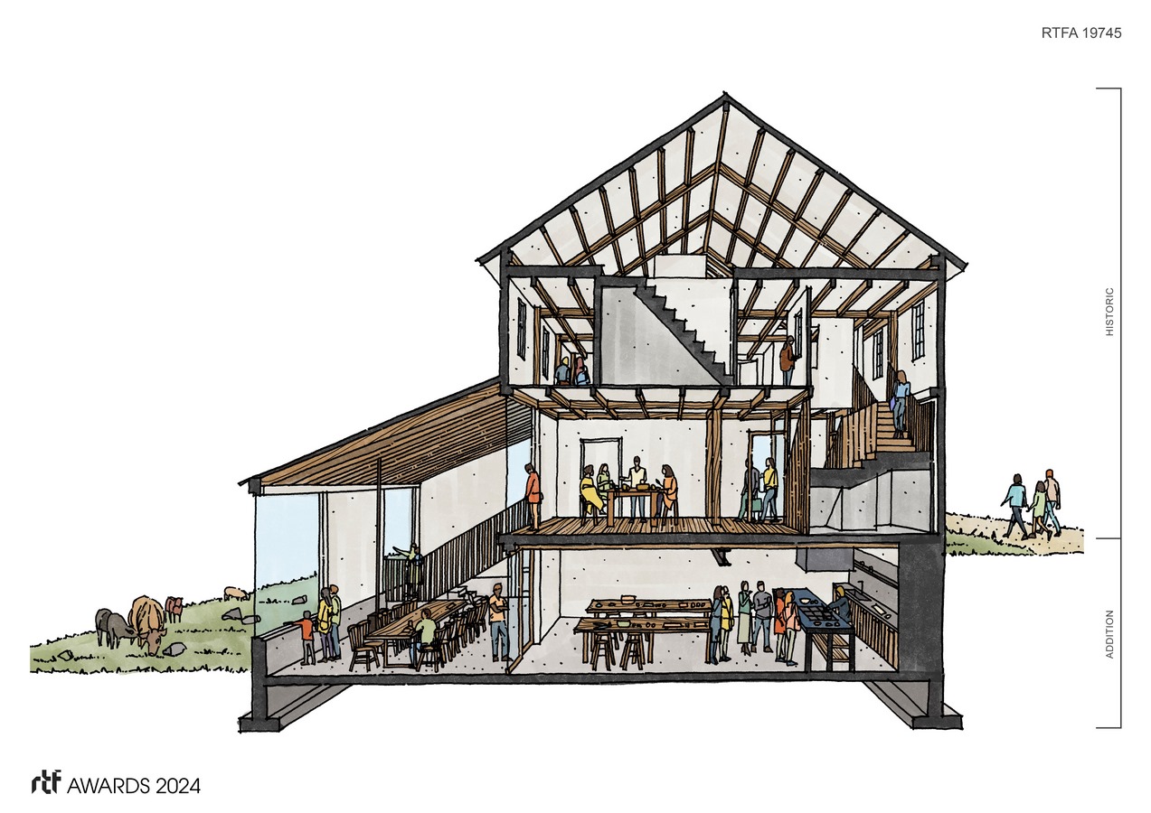 The new walk out basement of the Herb House is 21st century Shaker design, housing traditional arts classrooms. Large windows follow the language of voids seen in barns for wood or hay storage. Barn doors can cover the void becoming architecturally quiet. The addition is harmonious in shape and form with the historic structure, but it does not attempt to hide when it will be built.
