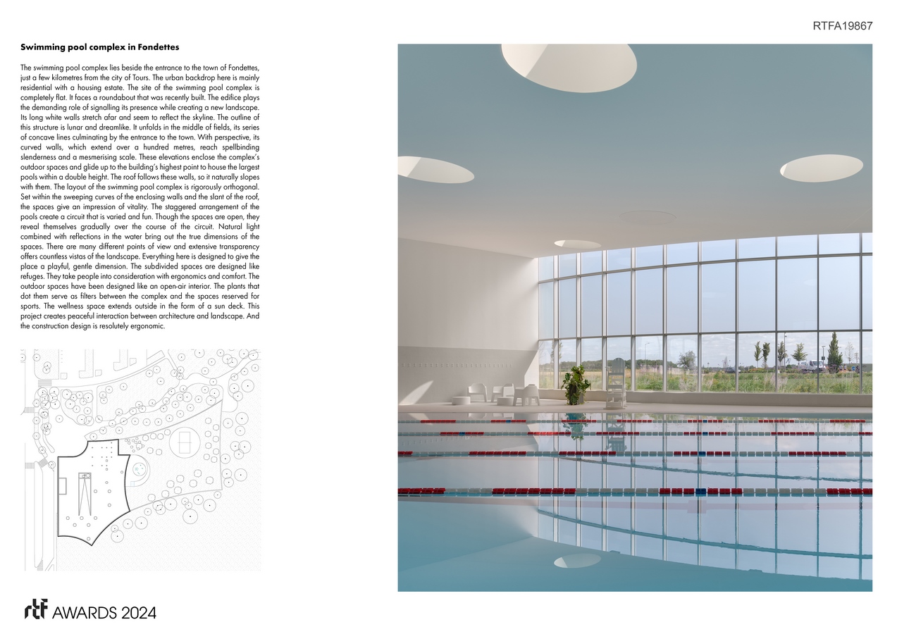The edifice plays the demanding role of signalling its presence while creating a new landscape. Its long white walls stretch afar and seem to reflect the skyline. The outline of this structure is lunar and dreamlike. It unfolds in the middle of fields, its series of concave lines culminating by the entrance to the town. With perspective, its curved walls, which extend over a hundred metres, reach spellbinding slenderness and a mesmerising scale. These elevations enclose the complex’s outdoor spaces and glide up to the building’s highest point to house the largest pools within a double height. The roof follows these walls, so it naturally slopes with them.