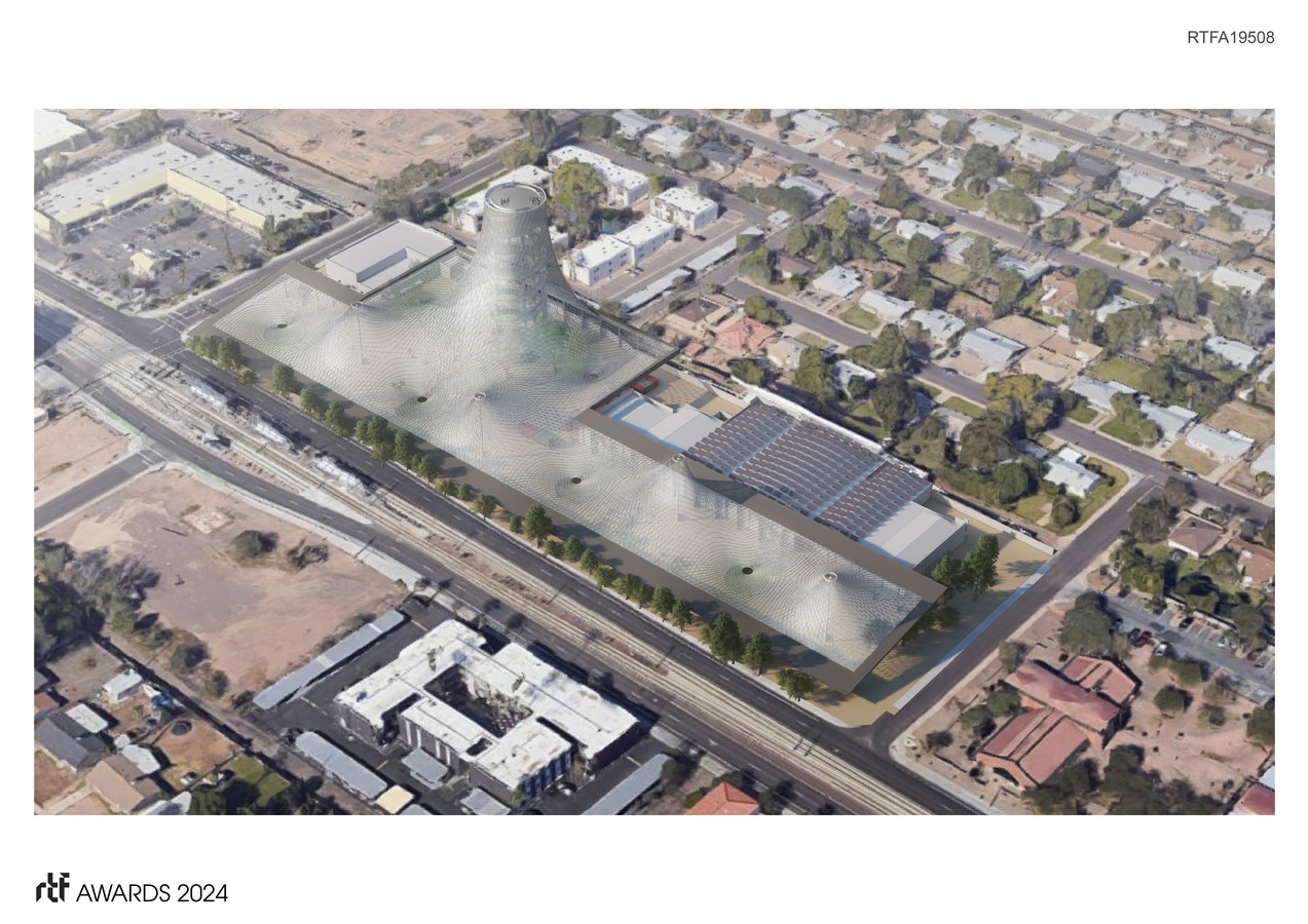 The proposed design for a resilience hub in Tempe, Arizona, USA, seeks to transform an existing vacant retail plaza lot into a large open space with a variety of public amenities. The purpose of the hub is to create a place of refuge during disruptive events, such as extreme heat days, and assist communities to recover from such events.