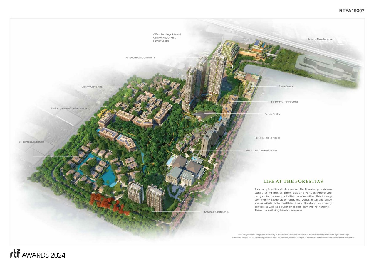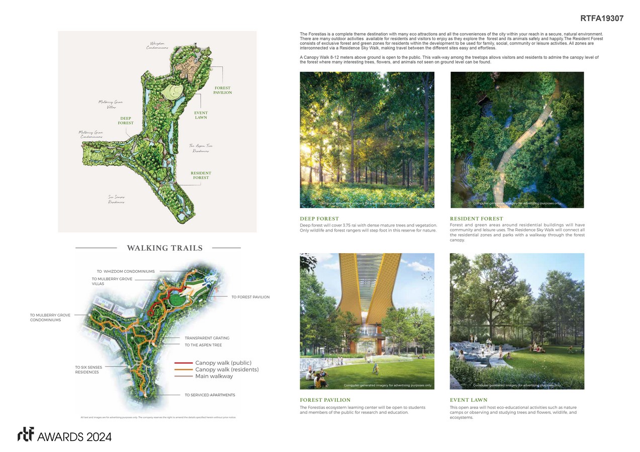 Designed to provide for all aspects of life under its sustainable concept, the Forestias comprises both commercial and residential zones, with a central forest and green community spaces catering to both residents and visitors. Its four residential concepts – Mulburry Grove, an ultra-luxury neighborhood of villas and condominiums under the concept of an ‘intergenerational living community. Whizdom, these condominiums unite vertical living with holistic well-being, connecting new generations with nature. The Aspen Tree, these fuII-service residences for elders are designed with the concept of ‘aging in place’, and Six Senses Residences, these residences form an exclusive neighborhood for only 27 families. Everything connects with nature. Living spaces are designed for ultimate comfort and offer lake and forest views. Additionally, the project boasts comercials buildings called HAPPITAT. This place offers lifestyle and family entertainment facilities, food & beverage outlets, activities for art & cultural pursuits, theatre, community markets, commercial spaces for offices, and public green spaces.