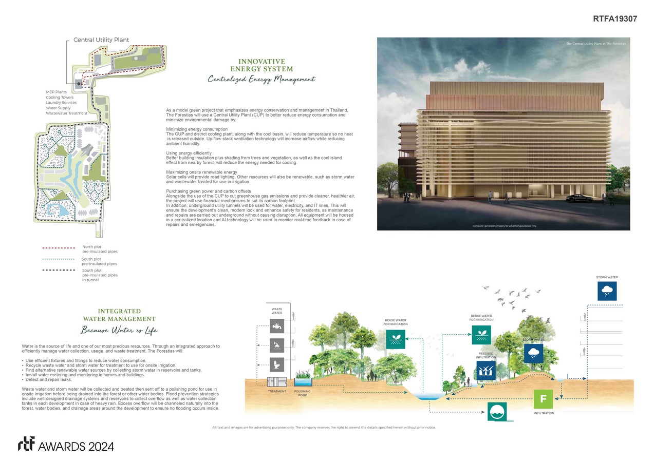 To address the social and environmental pain points of urban living, the project applies a multitude of innovative technologies and approaches to achieve sustainable well-being. In addition to devoting an unprecedented 56% of its area to forest and green spaces, the Forestias employs new approaches in its landscape and utility systems to minimize its environmental footprint. A cooling basin harnesses tree cover to reduce outdoor temperatures by 3-5°C, reversing the urban heat island effect. A central utility plant (CUP) supplies buildings across the site with cool water to avoid the heating impact of conventional air conditions.