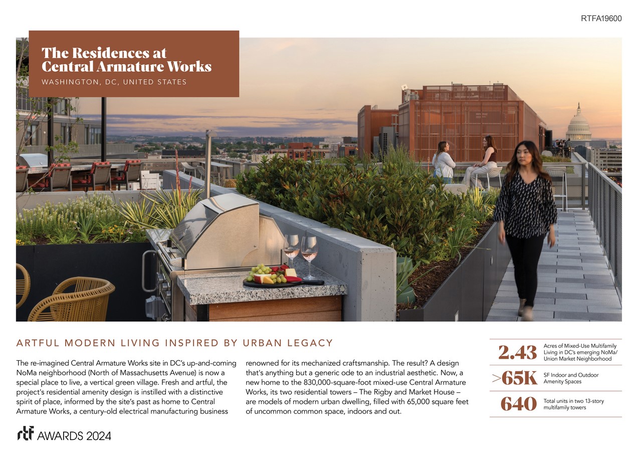 The re-imagined Central Armature Works site in DC’s up-and-coming NoMa neighborhood (North of Massachusetts Avenue) is now a special place to live, a vertical green village. Fresh and artful, the project’s residential amenity design is instilled with a distinctive spirit of place, informed by the site’s past as home to Central Armature Works, a century-old electrical manufacturing business renowned for its mechanized craftsmanship.