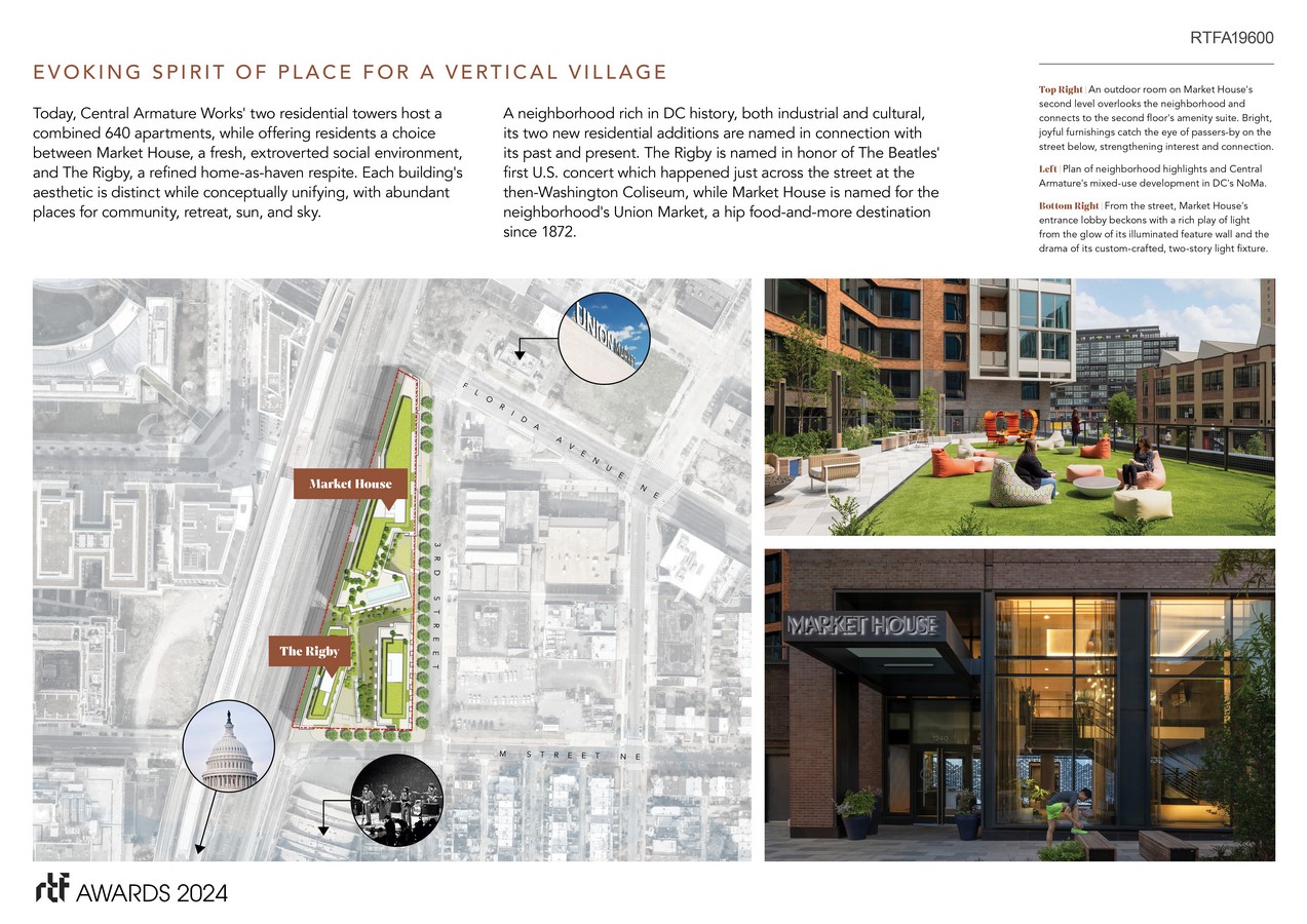 A Fitwel-certified residential community, connection with the outdoors is integral to both Market House and The Rigby. Spaces are designed to celebrate views of the NoMa neighborhood and the distinctly DC skyline, and residents have access to the amenities offered in both buildings, with the two buildings connected through a private courtyard. Pet-friendly, The Rigby and Market House outdoor environments range from intimate fireside lounges and cozy dining nooks to an outdoor yoga studio, lively poolside hubs, and a movie lounge under the stars.