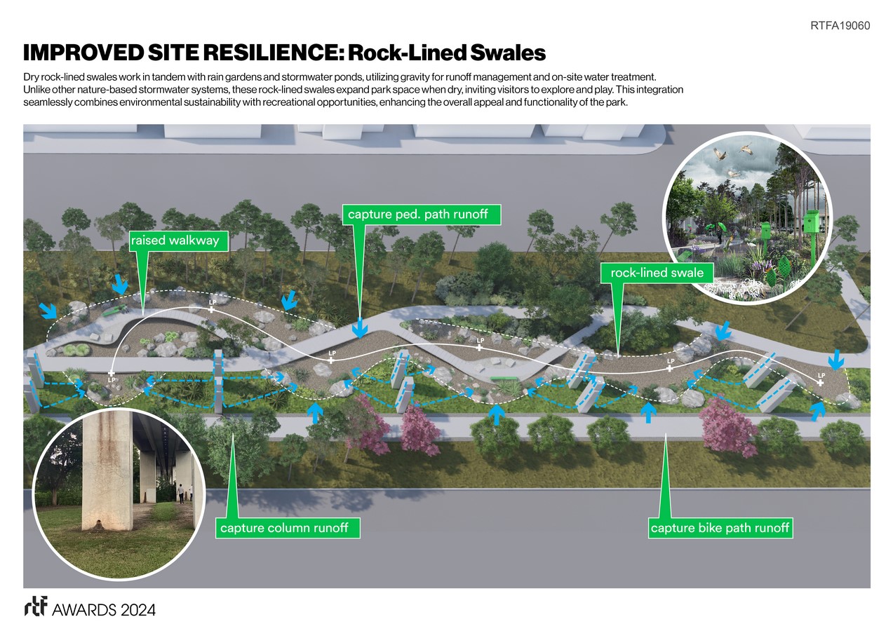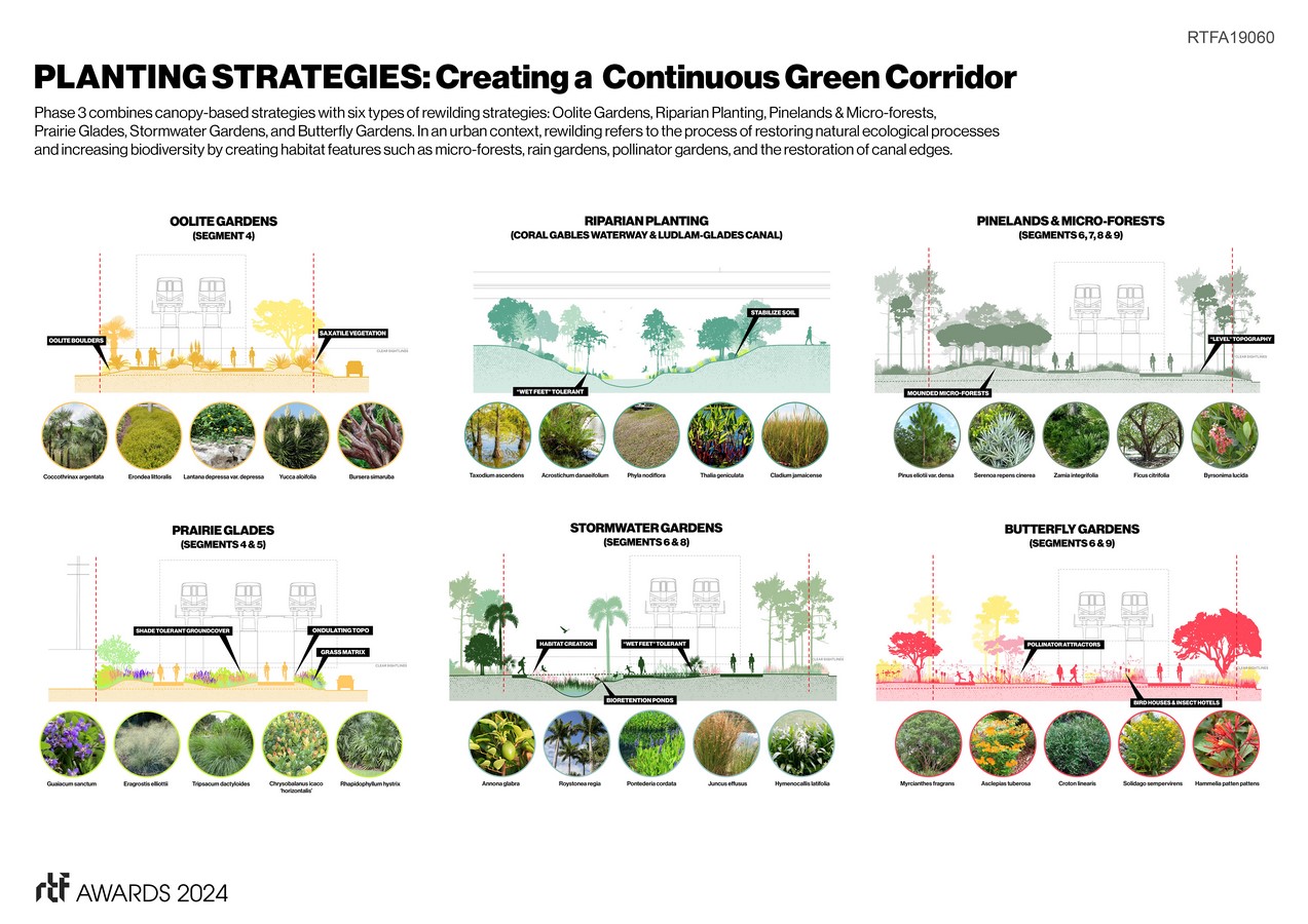This phase will have a total of 3,960 trees, including 1,800 new trees for a 62.5% increase in canopy. Sequestering carbon, increasing biodiversity, and mitigating heat and sound pollution, these trees are part of the design team’s vision combined with new strategies for re-naturalization in South Florida. These include oolite gardens, prairie glades, pine rocklands, hardwood hammock micro-forests, stormwater gardens, butterfly gardens, and riparian planting throughout this extension of the new linear park and trail.