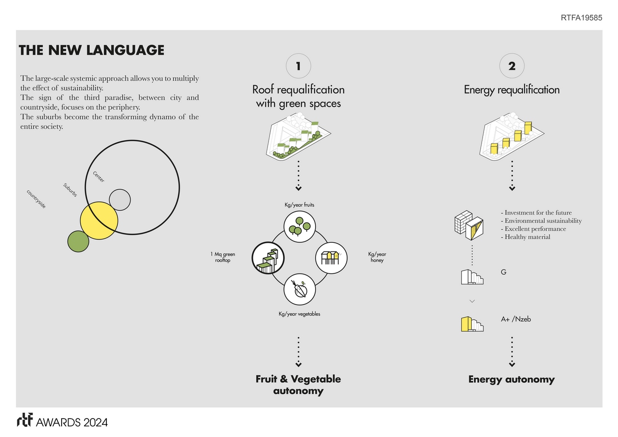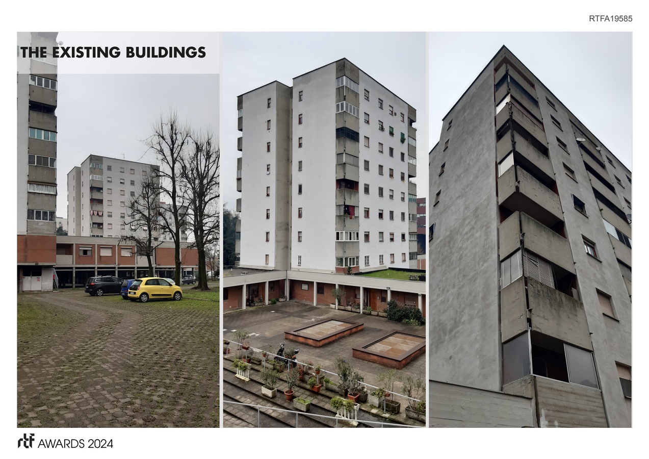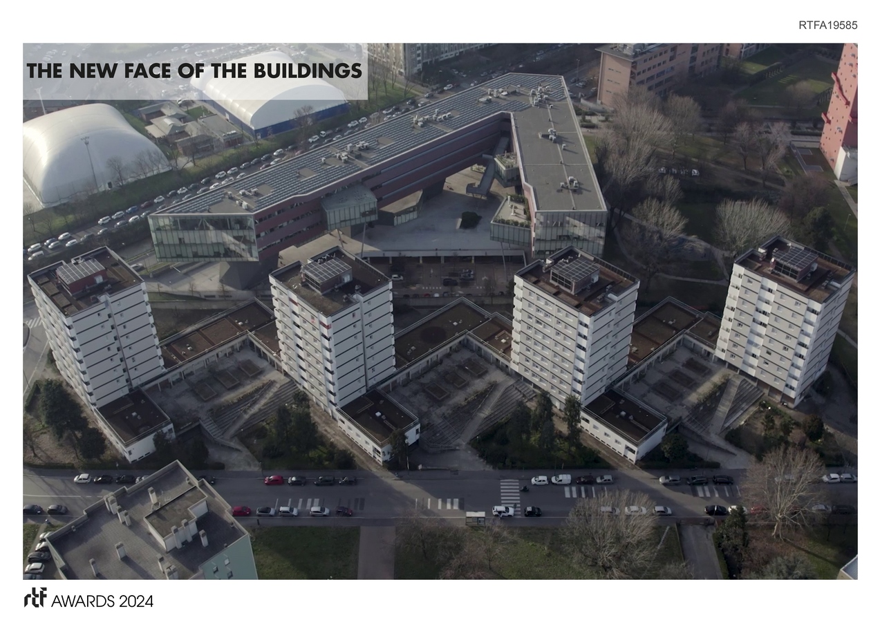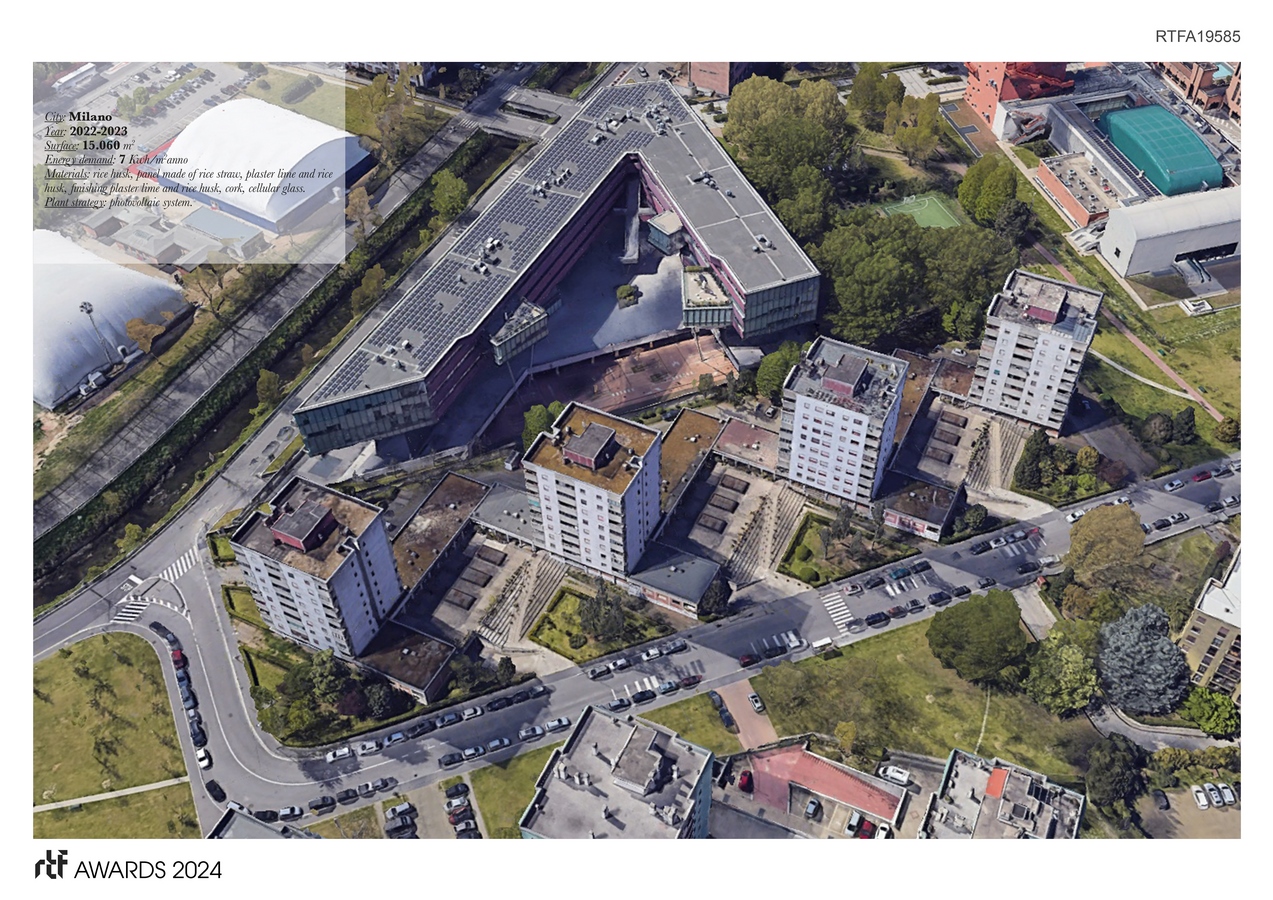 The social and urban regeneration of the four towers is carried out through an architectural project of energy redevelopment from class C to A4 with prefabricated technological system, which provides not only natural materials from waste of rice production.