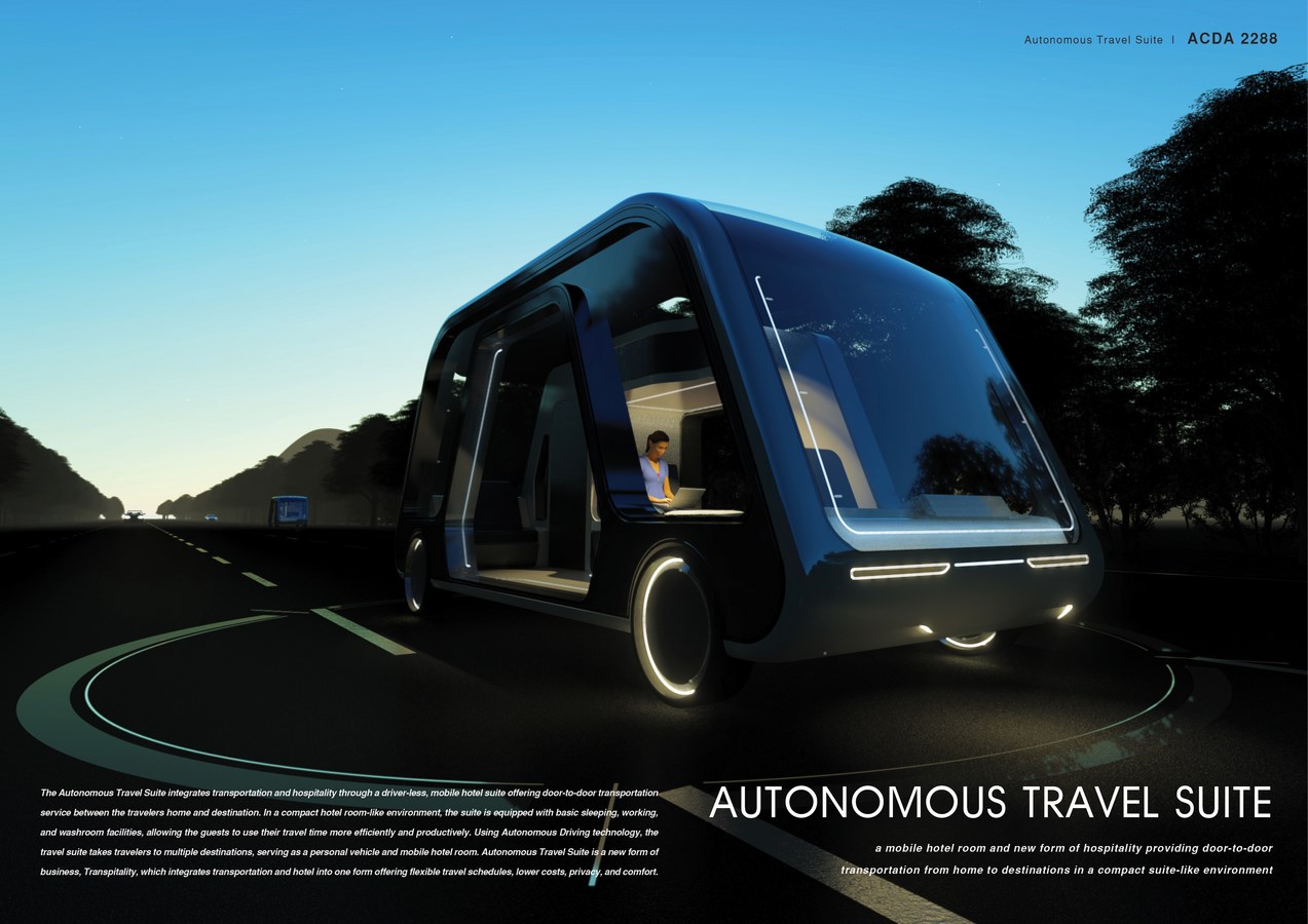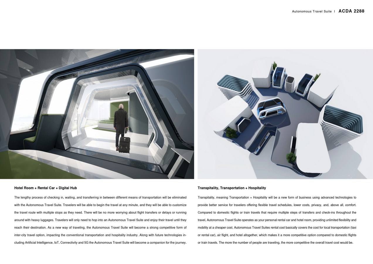 Autonomous Travel Suite introduces a new business concept named Transpitality, which extends a conventional scope of Hospitality to the field of Transportation. As Autonomous Driving Technology enables people to be freed from the driving wheel, interior spaces of vehicles will be turned into mobile rooms with customized layouts since people will be able to spend more time using the time more productively. In a broad definition, Transpitality means any kind of service that can be provided once you enter an Autonomous Driving Vehicle or Mobile Room. Autonomous Travel Suite shows the potential of consolidating different means of transportation and Hospitality service in a new way using emerging technologies.