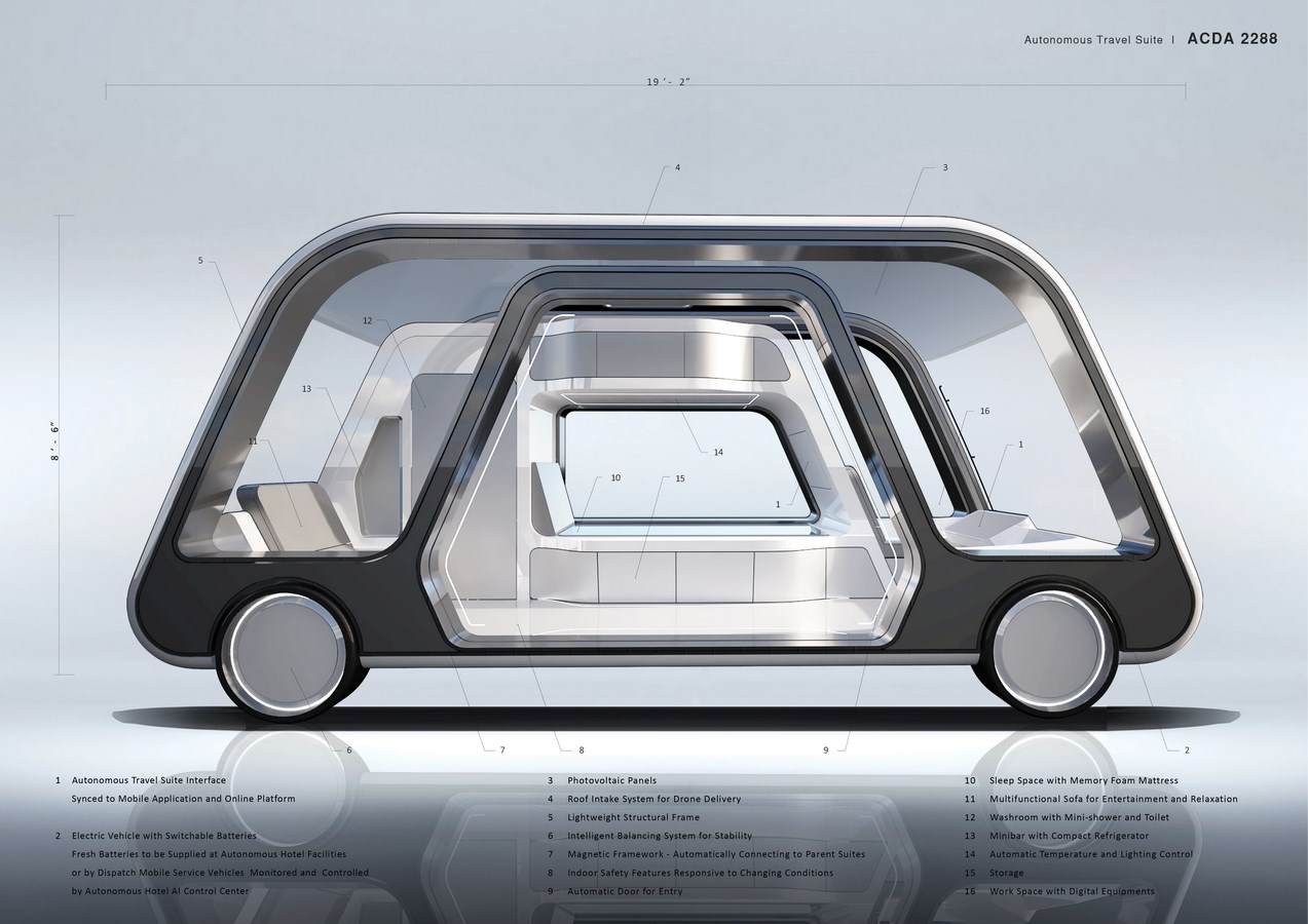 The Autonomous Travel Suite integrates transportation and hospitality through a driver-less, mobile hotel suite offering door-to-door transportation service between the traveler’s home and destination. In a compact hotel room environment, the suite is equipped with basic sleeping, working, and washroom facilities, allowing the guests to use their travel time more efficiently and productively. Using Autonomous Driving technology, the travel suite takes you to multiple destinations, serving as the traveler’s personal vehicle and mobile hotel room.