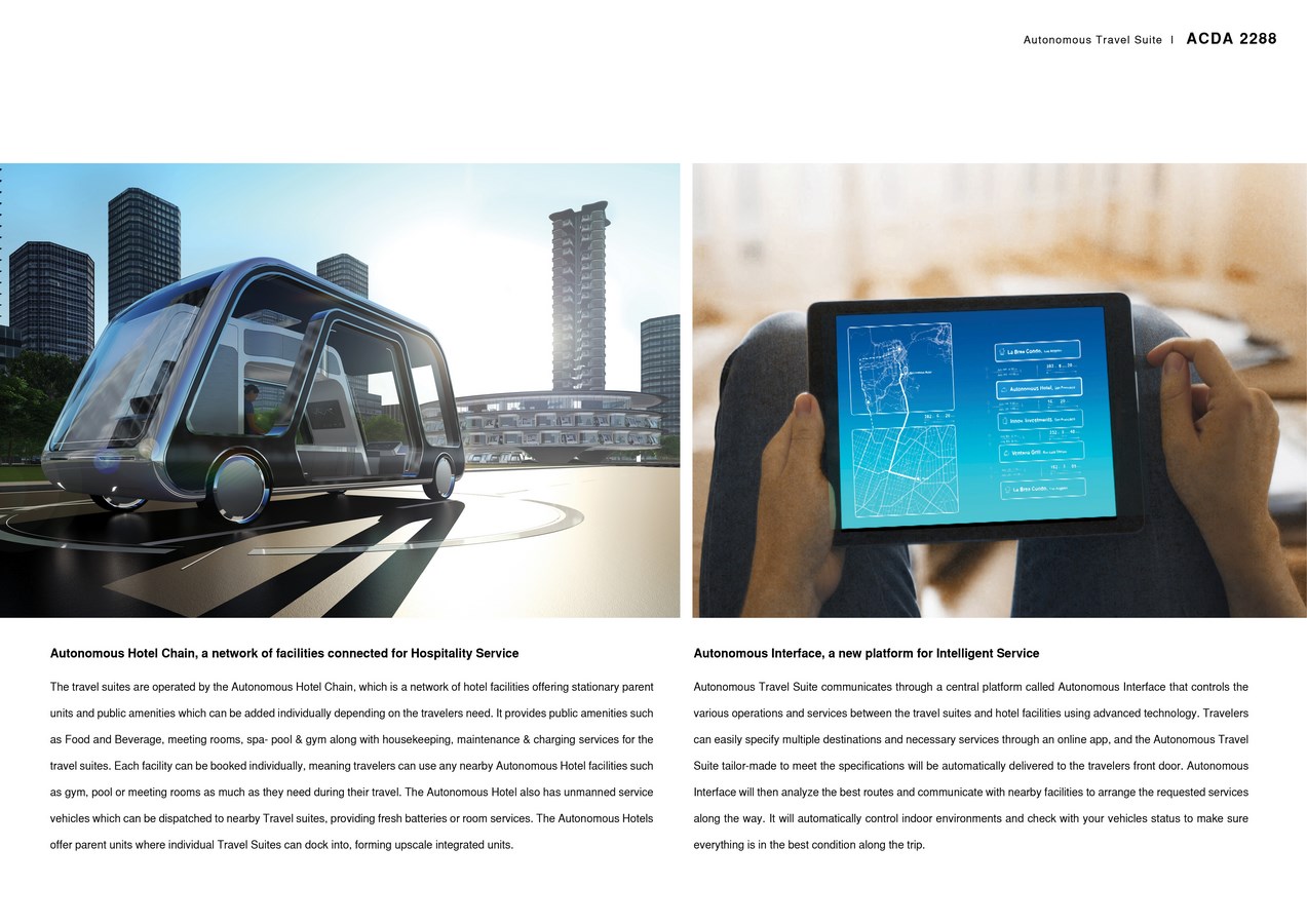 Autonomous Travel Suite communicates through a central platform called Autonomous Interface that controls the various operations and services between the travel suites and hotel facilities using advanced technology. Travelers can easily specify multiple destinations and necessary services through an online app, and the Autonomous Travel Suite tailor-made to meet the specifications will be automatically delivered to the travelers’ front door. Autonomous Interface will then analyze the best routes and communicate with nearby facilities to arrange the requested services along the way. It will automatically control indoor environments and check with your vehicle’s status to make sure everything is in the best condition along the trip.