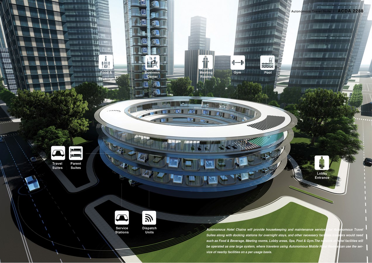 The Autonomous Travel Suites are operated by the Autonomous Hotel Chain, which is a network of hotel facilities offering stationary parent units and public amenities which can be added individually depending on the travelers need. It provides public amenities such as Food and Beverage, meeting rooms, spa- pool & gym along with housekeeping, maintenance & charging services for the travel suites. Each facility can be booked individually, meaning travelers can use any nearby Autonomous Hotel facilities such as gym, pool or meeting rooms as much as they need during their travel. Autonomous Hotel also has unmanned service vehicles that can be dispatched to the nearby Autonomous Travel Suites, providing fresh batteries or room services. Autonomous Hotels offer parent units where individual Autonomous Travel Suites can dock into, forming upscale integrated units.