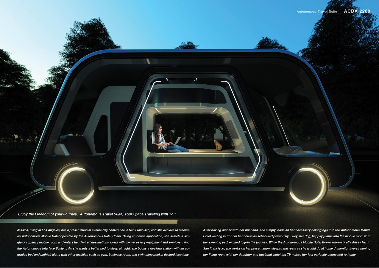 Autonomous Travel Suite is a new form of business (named Transpitality) which integrates transportation and hotel into one form offering flexible travel schedules, lower costs, privacy, and, above all, comfort. Compared to domestic flights or train travels that require multiple steps of transfers and check-ins throughout the travel, Autonomous Travel Suite operates as your personal rental car and hotel room, providing unlimited flexibility and mobility at a cheaper cost.