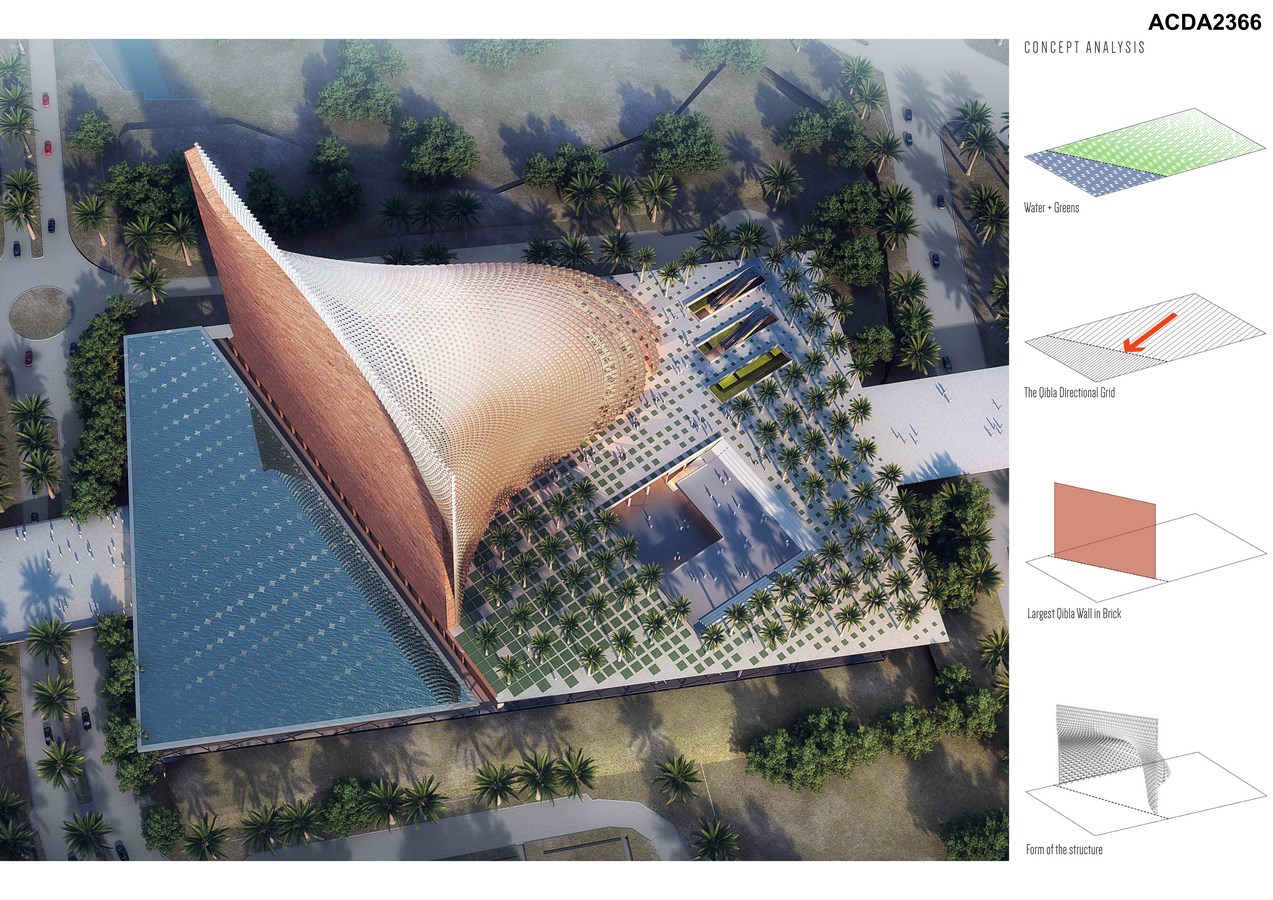 The main element of this Iconic Mosque is the shell with its stalactite shaped geometry referencing Muquarnas (a form of ornamented vaulting in Islamic architecture)