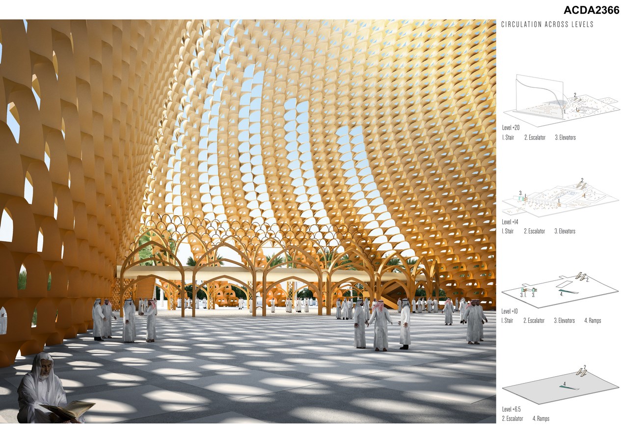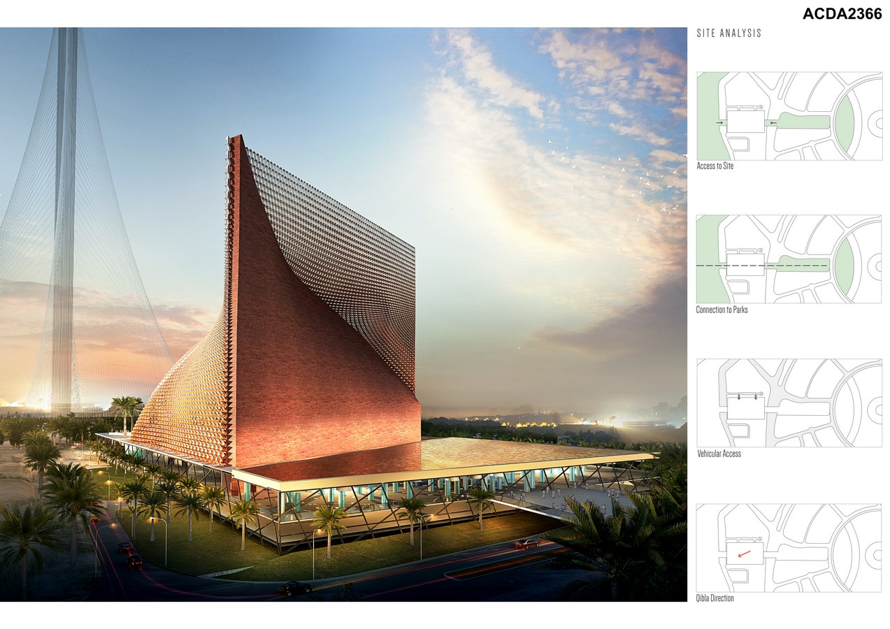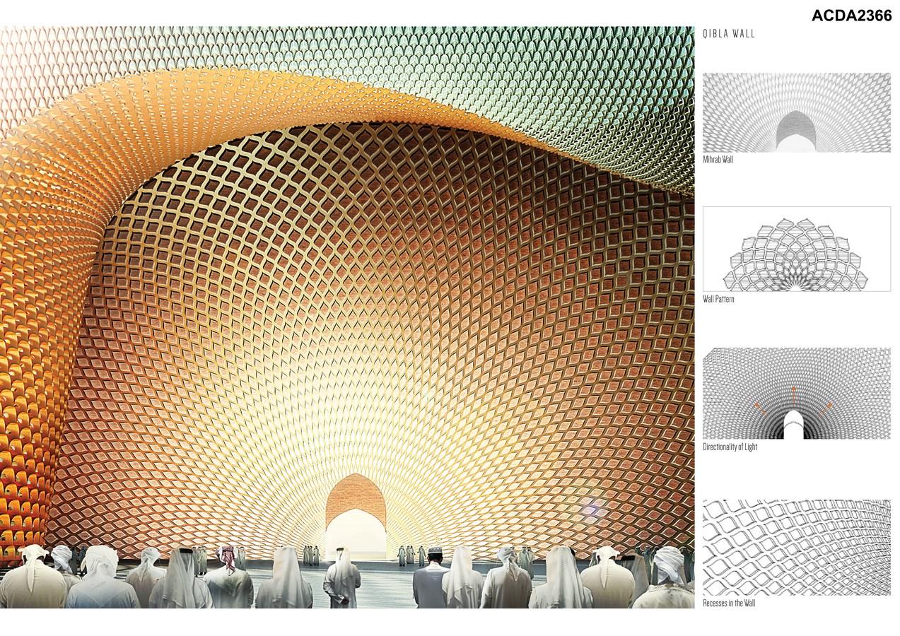The design offers multiple applications of 3d printed brick throughout its main architectural elements such as the shell of the mosque as well as its internal spaces. For example, the bricks used at the Qibla wall could be 3d-printed making it the largest Qibla wall in a mosque that is entirely made of 3d printed brick thus supporting the UAE’s goal of becoming the future leader in 3d printing where by the year 2030, 25% of Dubai’s construction materials have to be 3d printed.