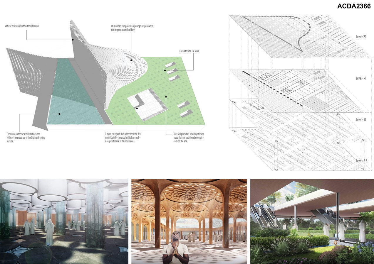 On +20 level which is the main level, we have created a sunken courtyard that references the first masjid built by the prophet Mohammad – Mosque of Quba’ in its dimensions. This courtyard is home to a shaded outdoor area (accessible roof) to house additional praying area for 2000 people. The shaded courtyard also serves an important environmental consideration in acting as a thermal regulator. The system of using natural ventilation created within the thick brick wall of the Qibla is based on the use of wind towers in the traditional architecture of Dubai.