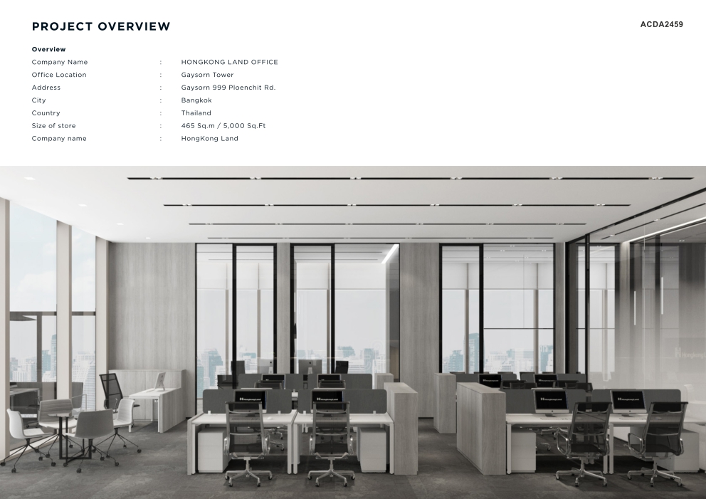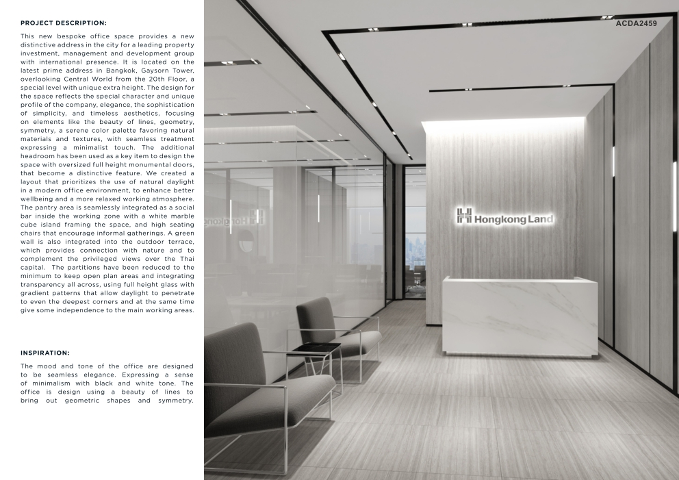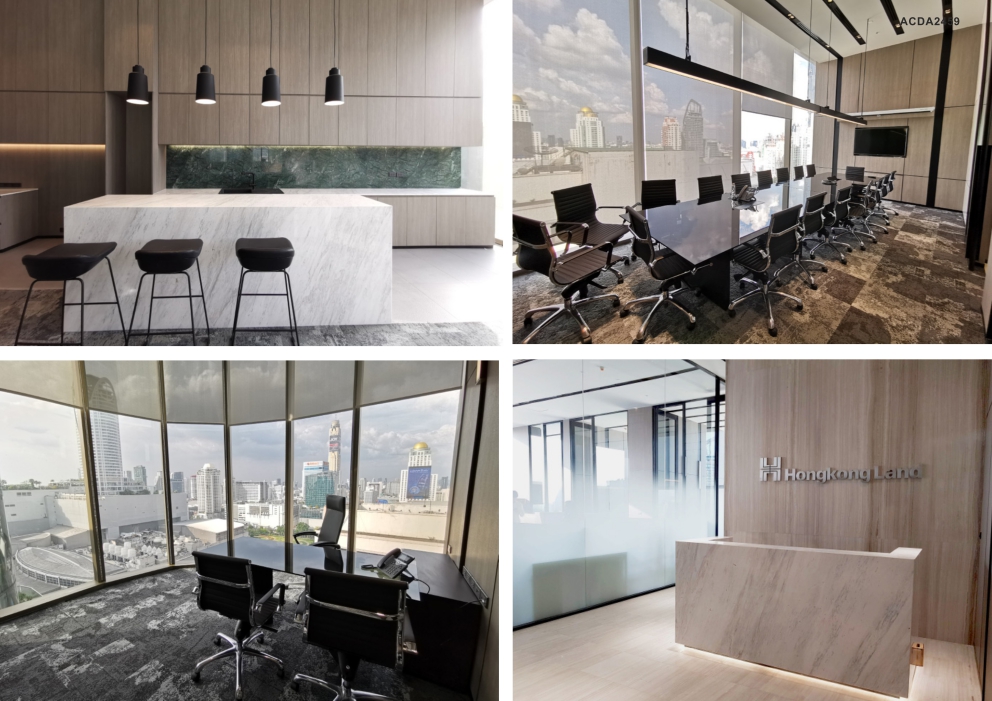 This new bespoke office space provides a new distinctive address in the city for a leading property investment, management and development group with international presence. It is located on the latest prime address in Bangkok, Gaysorn Tower, overlooking Central World from the 20th Floor, a special level with unique extra height.