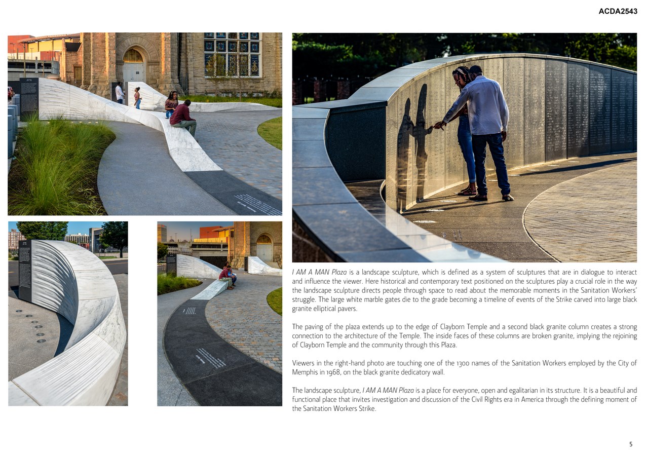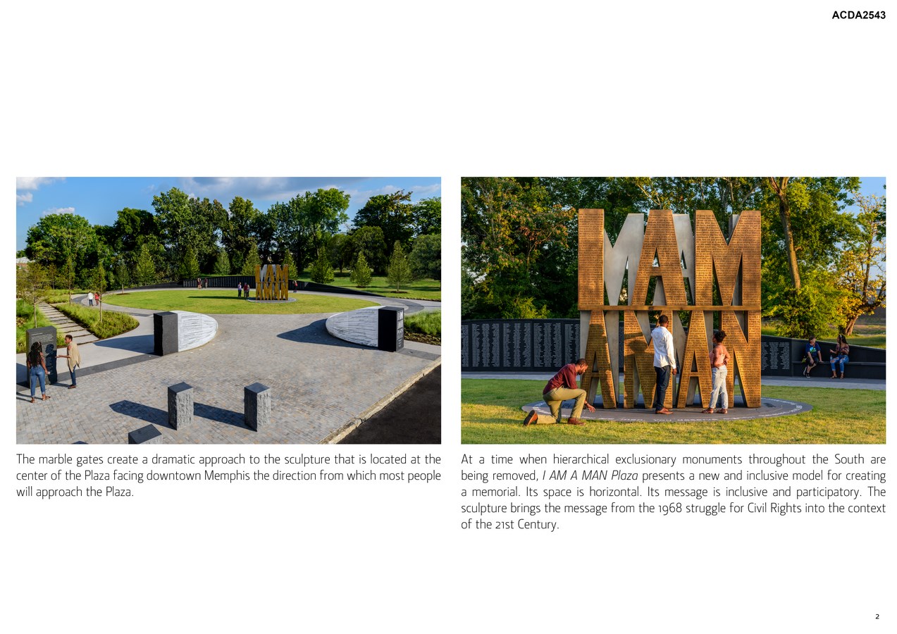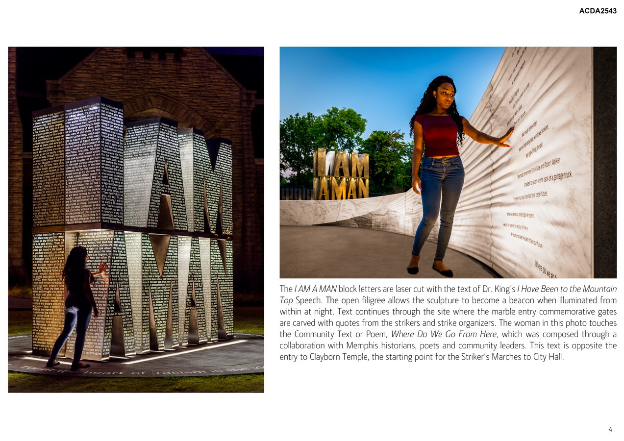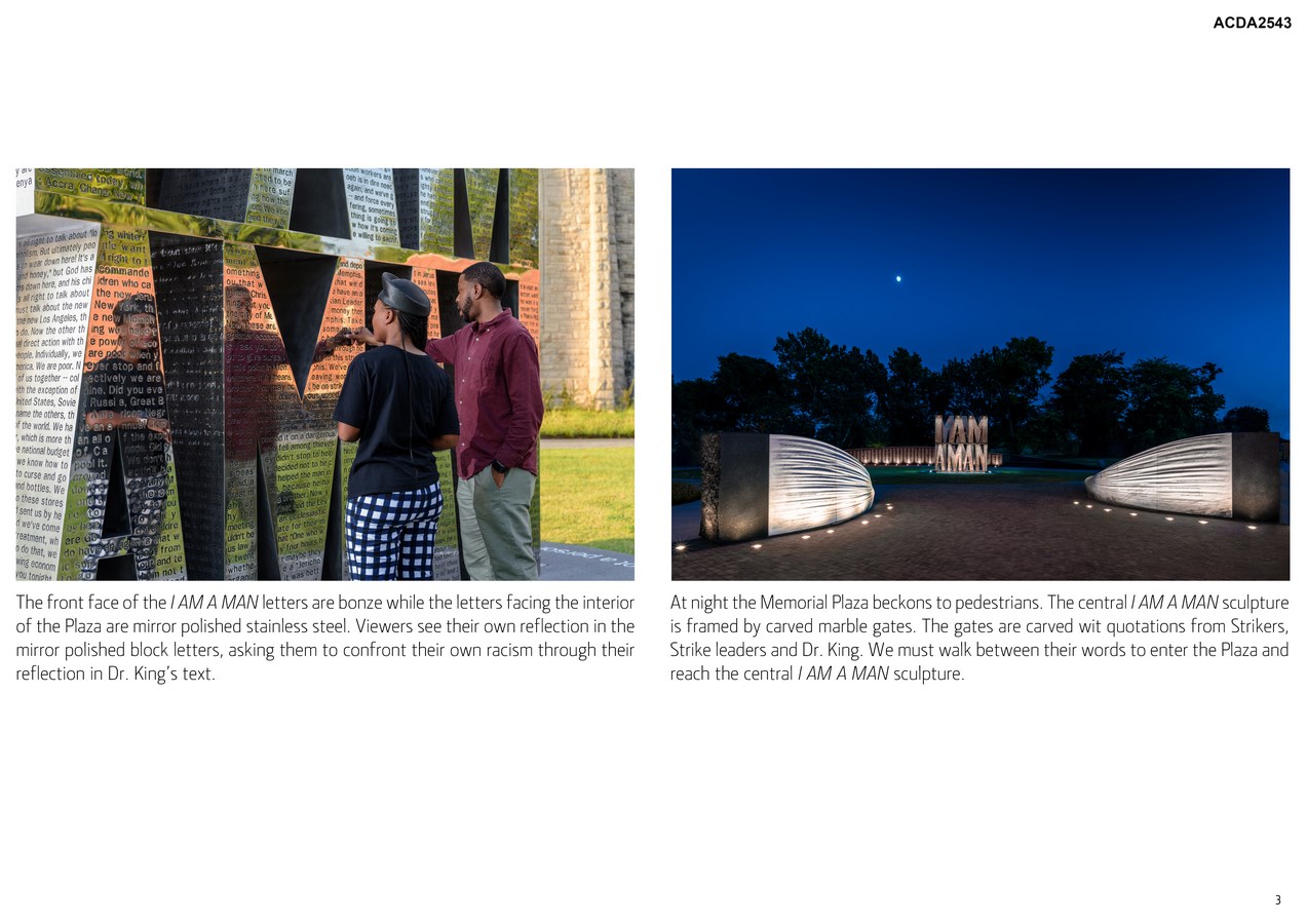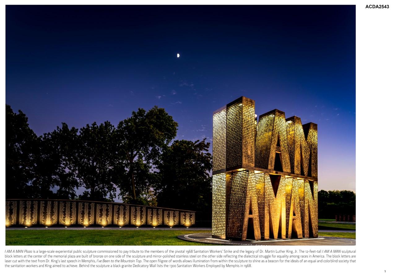 I AM A MAN Plaza will provide visitors a continuing point of reflection and inspiration on the events of 1968 within this National Historic Landmark site. Here, sculpture and poetry combine to create an interactive and educational experience inspiring future generations to stand up for social justice and positive change.