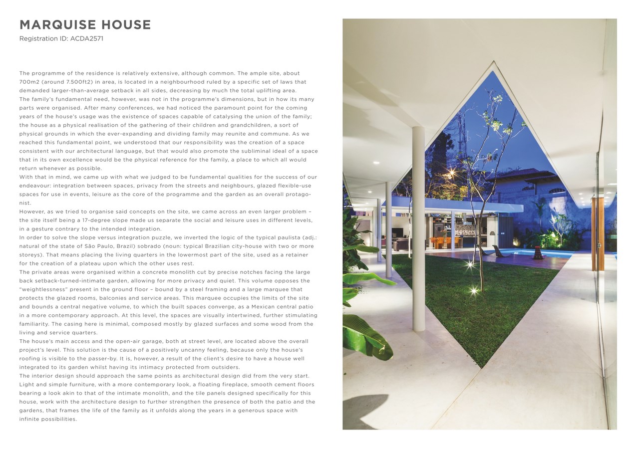 The houseโs main access and the open-air garage, both at street level, are located above the overall projectโs level. This solution is the cause of a positively uncanny feeling, because only the houseโs roofing is visible to the passer-by. It is, however, a result of the clientโs desire to have a house well integrated to its garden whilst having its intimacy protected from outsiders. The interior design should approach the same points as architectural design did from the very start. Light and simple furniture, with a more contemporary look, a floating fireplace, smooth cement floors bearing a look akin to that of the intimate monolith, and the tile panels designed specifically for this house, work with the architecture design to further strengthen the presence of both the patio and the gardens, that frames the life of the family as it unfolds along the years in a generous space with infinite possibilities.