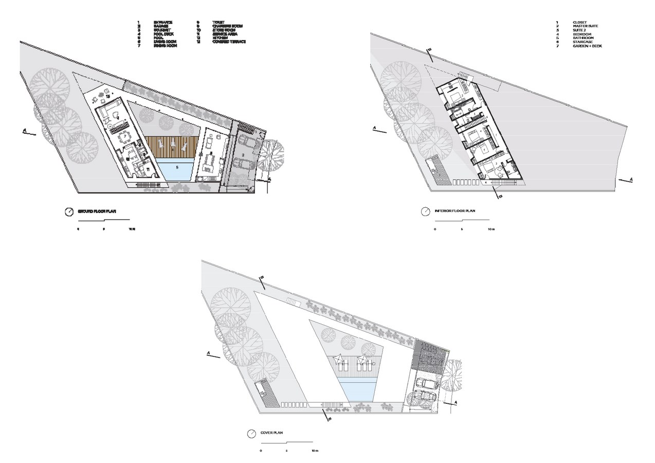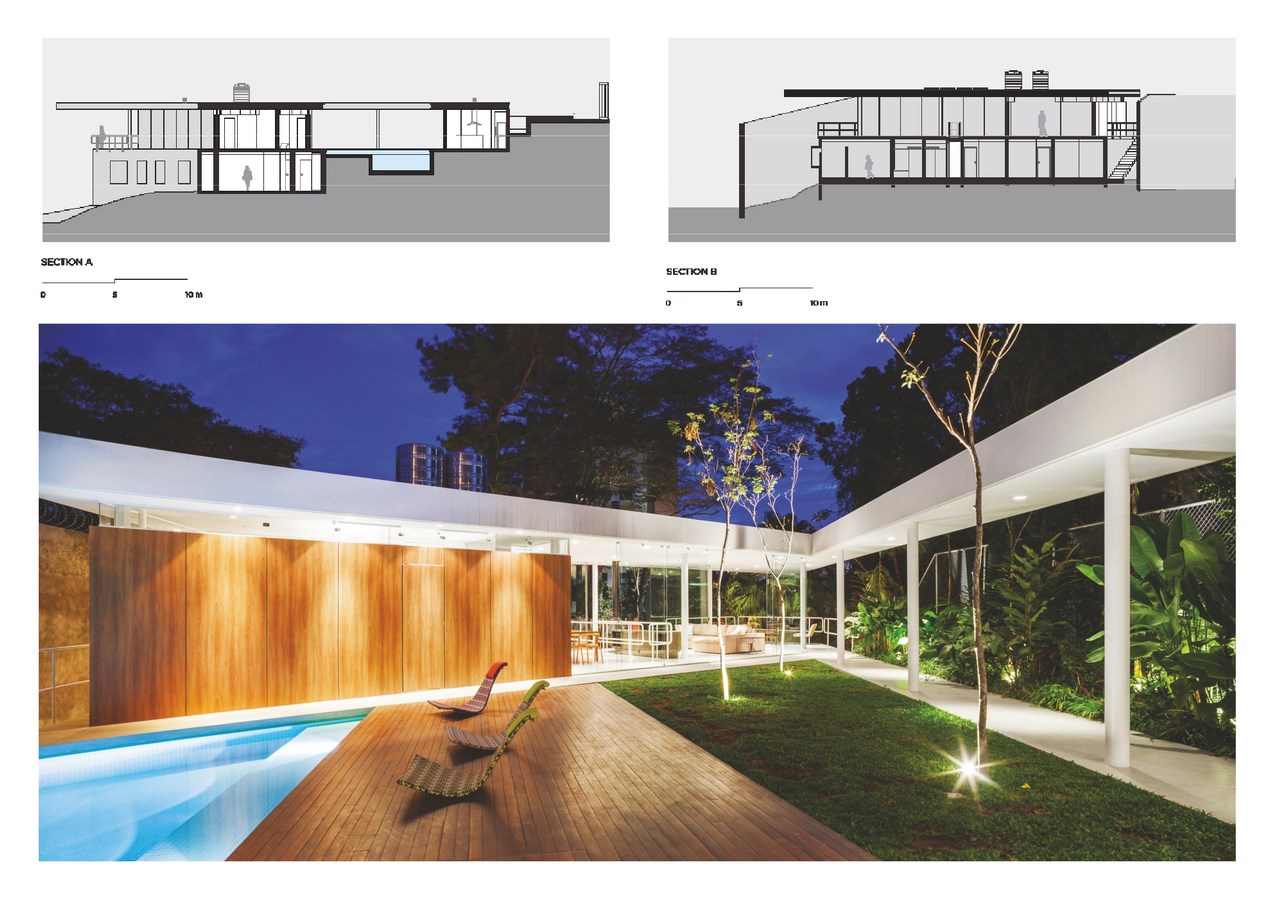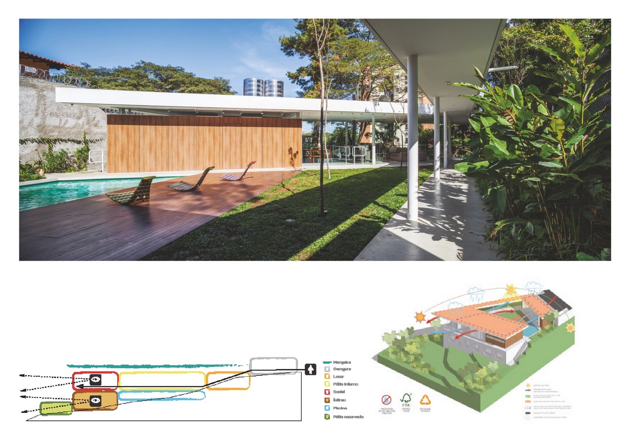 In order to solve the slope versus integration puzzle, we inverted the logic of the typical paulista (adj.: natural of the state of Sรฃo Paulo, Brazil) sobrado (noun: typical Brazilian city-house with two or more storeys). That means placing the living quarters in the lowermost part of the site, used as a retainer for the creation of a plateau upon which the other uses rest.