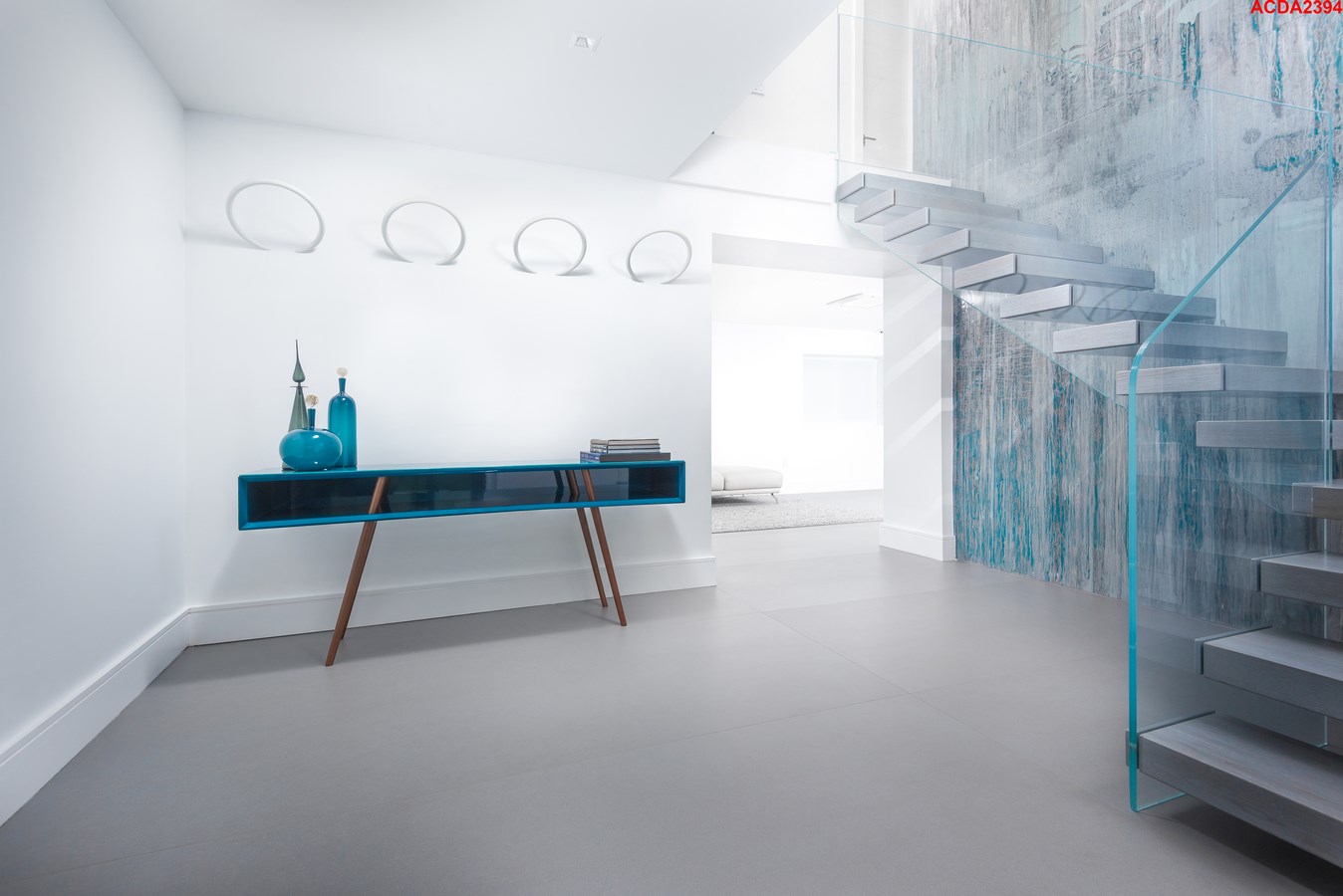 The standout feature was to be impressive, inspiring, yet uncomplicated. The team commissioned Alex Turco to bring that vision to life. They designed a vivid backdrop to the floating staircase in dripping shades of blue.
