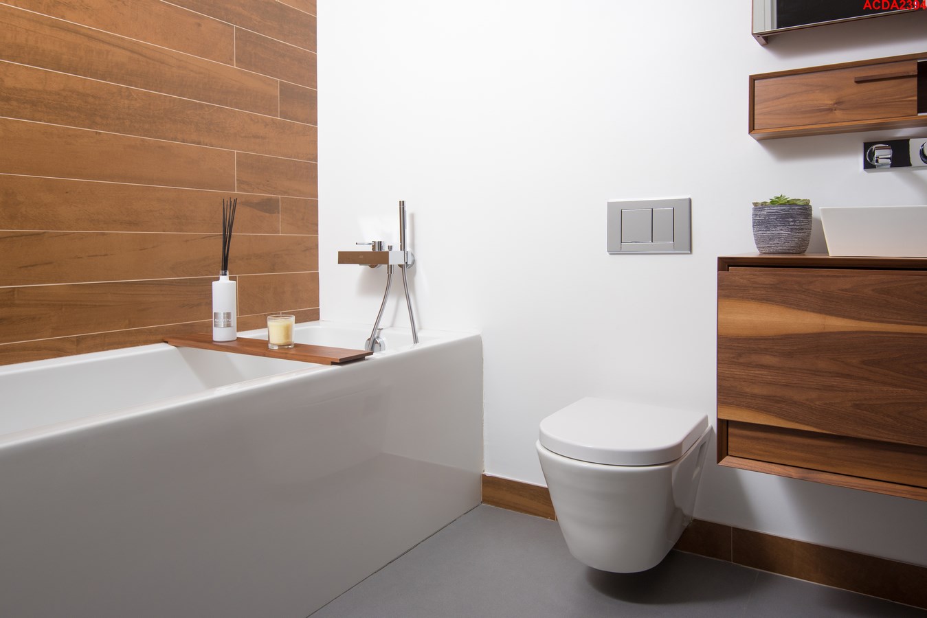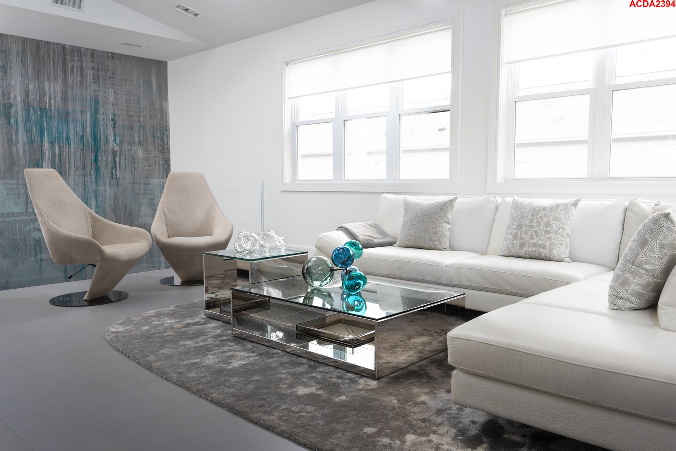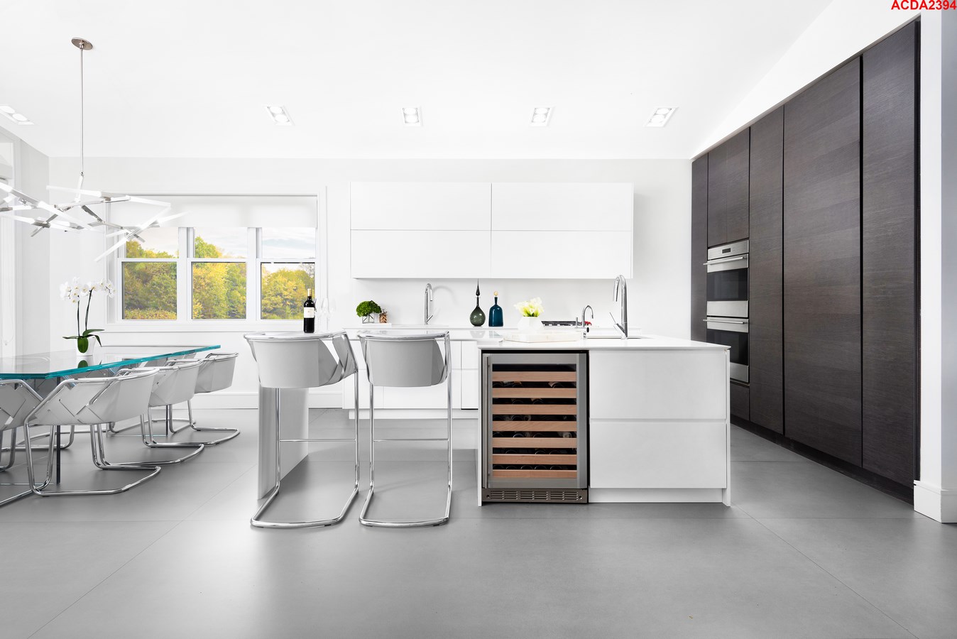 The over scale art install is finished in textured epoxy resin, which bounces off all the natural light streaming in from the countless windows. Clean sheets of glass serve as a staircase railing, enhancing the immaculate mood, and doesn’t distract from the statement wall treatment. Instead of fussy sconces or table lamps, the entry console by Roberta Schilling is lit up by five wall piercing from Flos Lighting’s Soft Architecture line. The kitchen is bright and contemporary, yet practicality was not spared in the process; there are seating options aplenty for both the family and guest. The modern dinette fixture is by Roll and Hill. The master bath takes a zen approach to the modern design of the home, utilizing wood tones and clean lines.