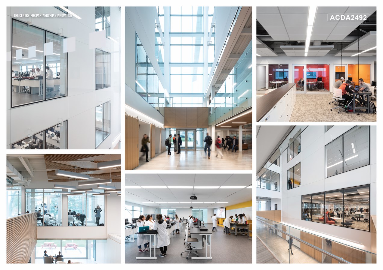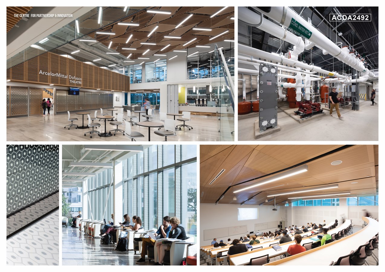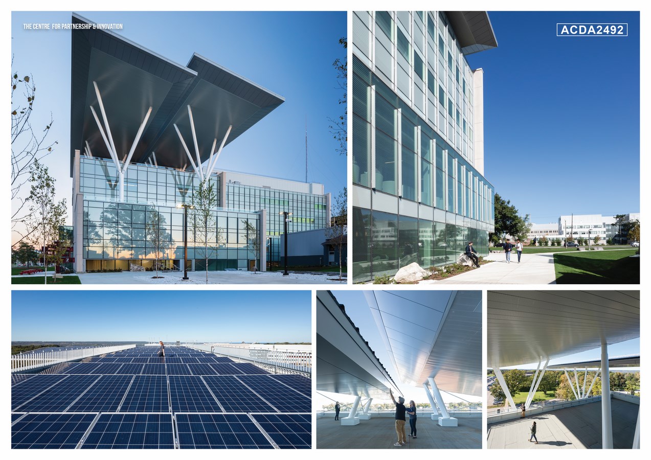 Driven by a side-by-side vigilant adherence to both the financial and energy budgets, accounting for the eventual energy consumption of all building sub-systems — e.g. including lab equipment, mechanical systems, and a realistic allowance for unregulated plug loads such as laptops—this all-electric building is designed to meet rigorous net zero energy and carbon performance targets and incorporates the latest in energy-efficient materials and processes. The facility features solar-powered, state-of-the-art labs, workshops, open study spaces and flexible lecture theatres. The mechanical and electrical spaces, as well as the green roofs with prominently displayed photo-voltaic arrays, are accessible to all and intended to be part of the learning environment.