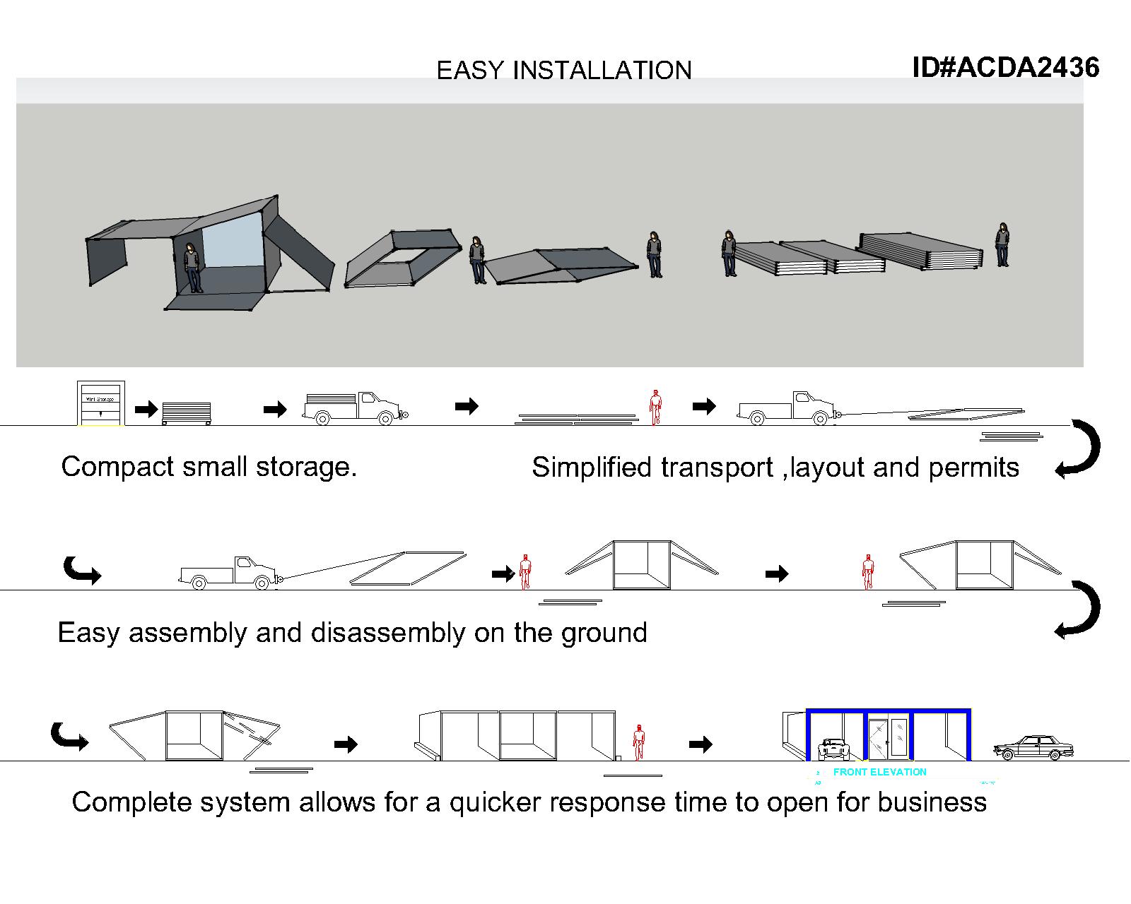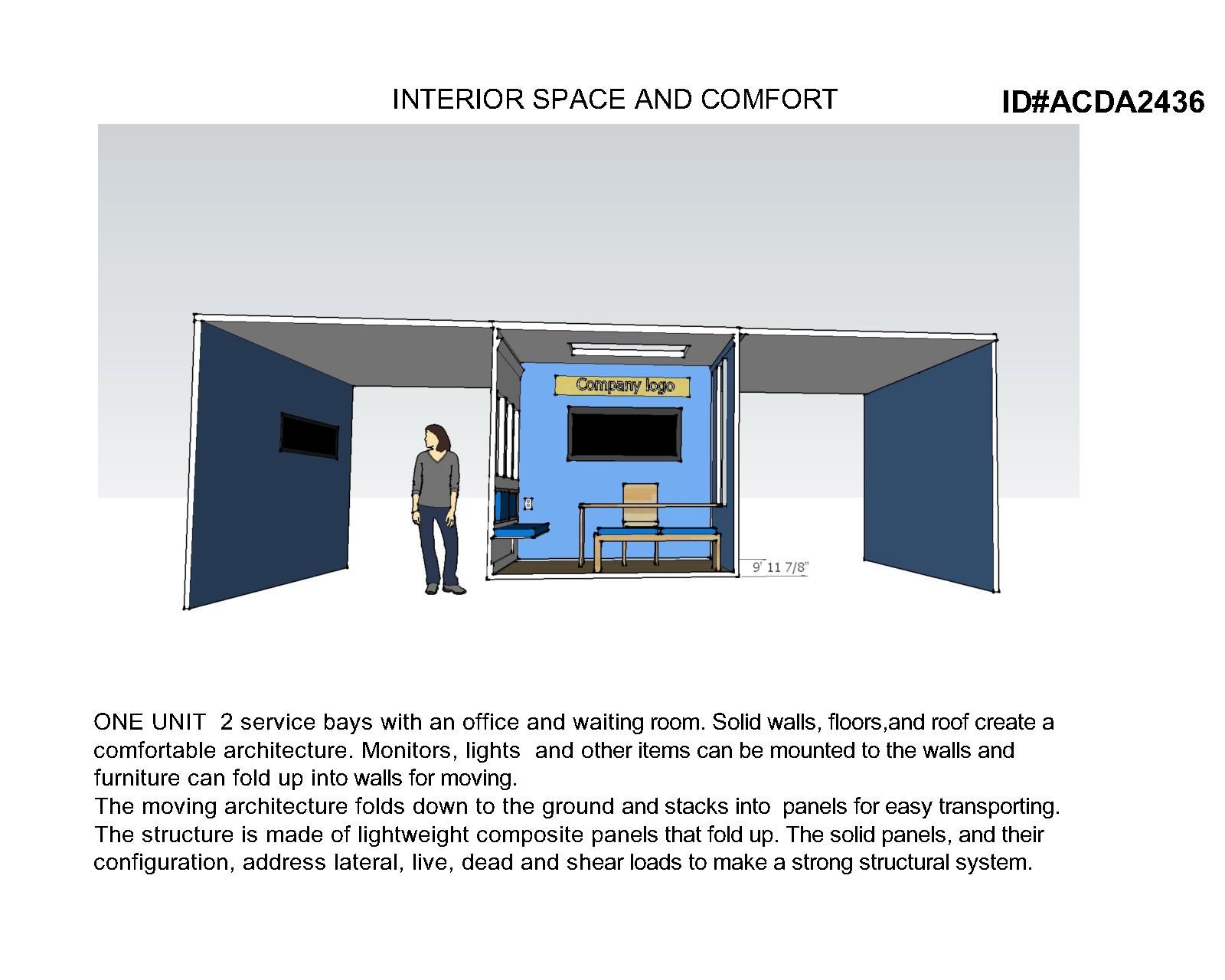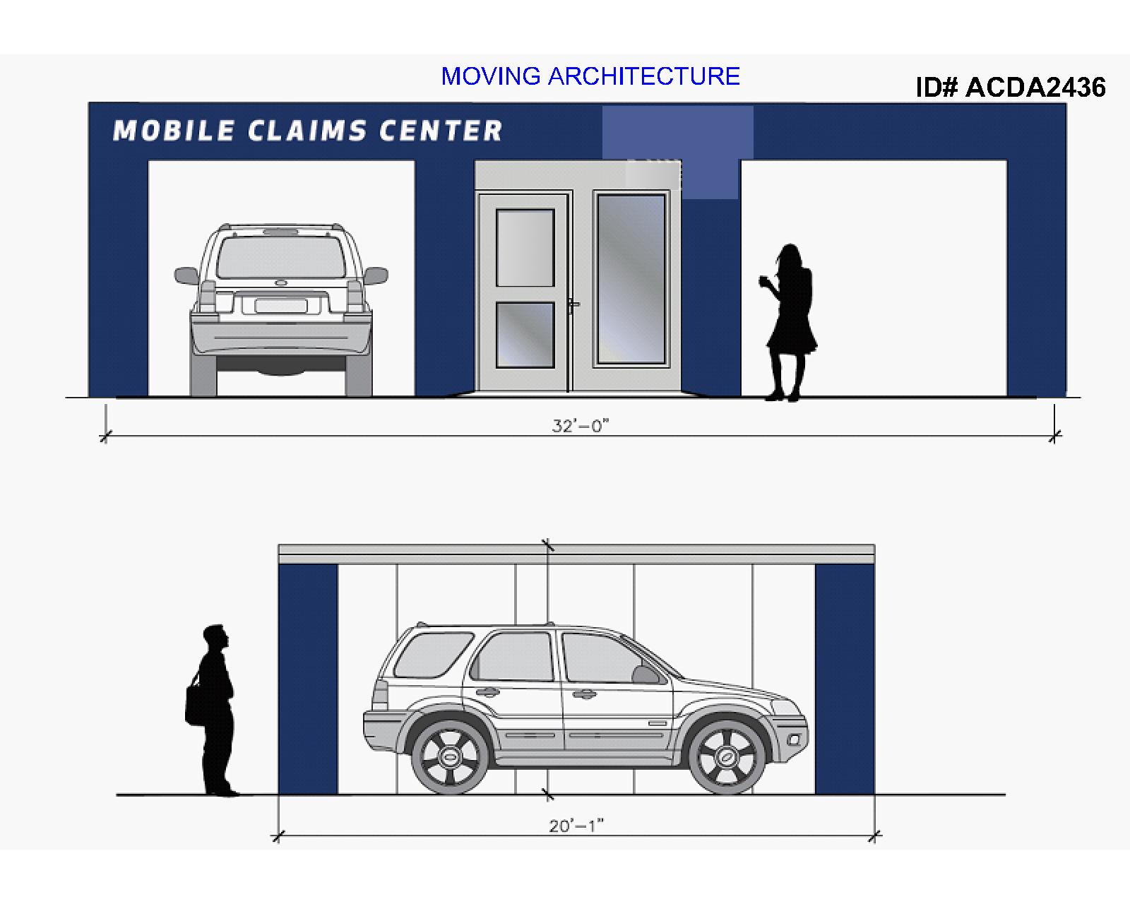Moving Architecture provides a better working environment for the insurance company staff and clients to evaluate car and truck storm damage. The vehicles need to be dry and undercover when evaluated for quick accuracy. The architecture is made of solid hard walls, floors, doors, windows, ramps, walks and roofs. This new architecture system is easy to erect and move. Designed to not use stakes, drilling, hand tools, ladders, cranes, heavy equipment, or large crews to install the structure on-site. The structure folds into a standard size panel for easy loading and storing. Structure is weather resistant from wind, rain, snow, hail, and heat. The units meet building codes and are ballasted to meet uplift requirements. This design is strong, weather-tight and flexible to meet electrical power, ventilation, solar power, data, and future technology and displays as needed.