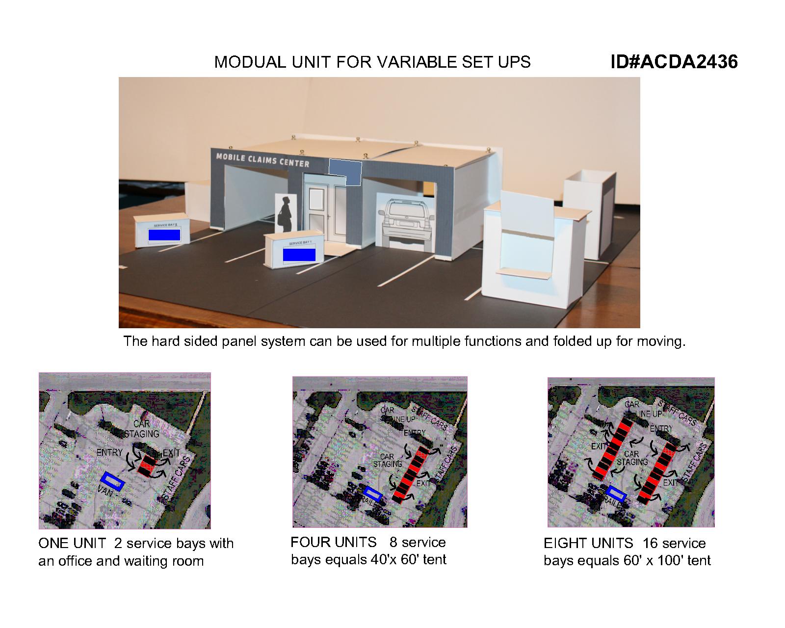 The automobile coverage side is just one part of the insurance company’s responsibility to repair and fix the cars and trucks that are damaged in these storms for their customers. The frequency of storms has made responding a year round operation nationwide. This design is to replace the current set up of large festival staked type tents in parking lots in storm path areas.