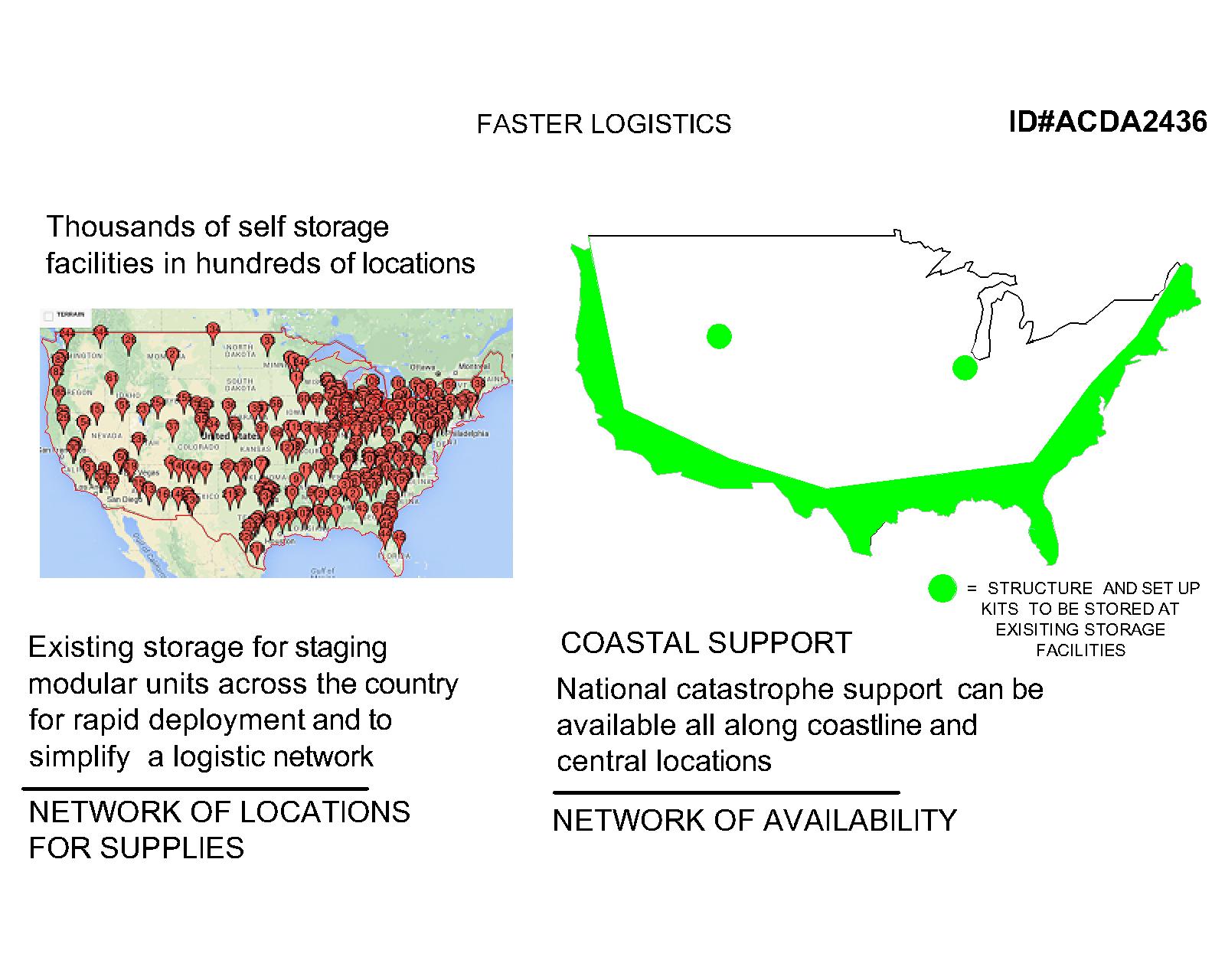 The units can be stacked and stored in small areas across the county for quick and easy response time to the emergency locations. The modular design allows for units to be added or removed as needed for staffing and scheduling demands. The architecture provides good lighting, are dry, solid and A.D.A. accessible structures. This higher level of comfort and service to the whole national catastrophe operation improves the corporation’s image and public awareness.