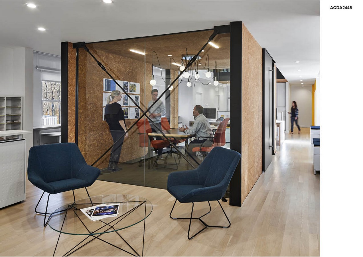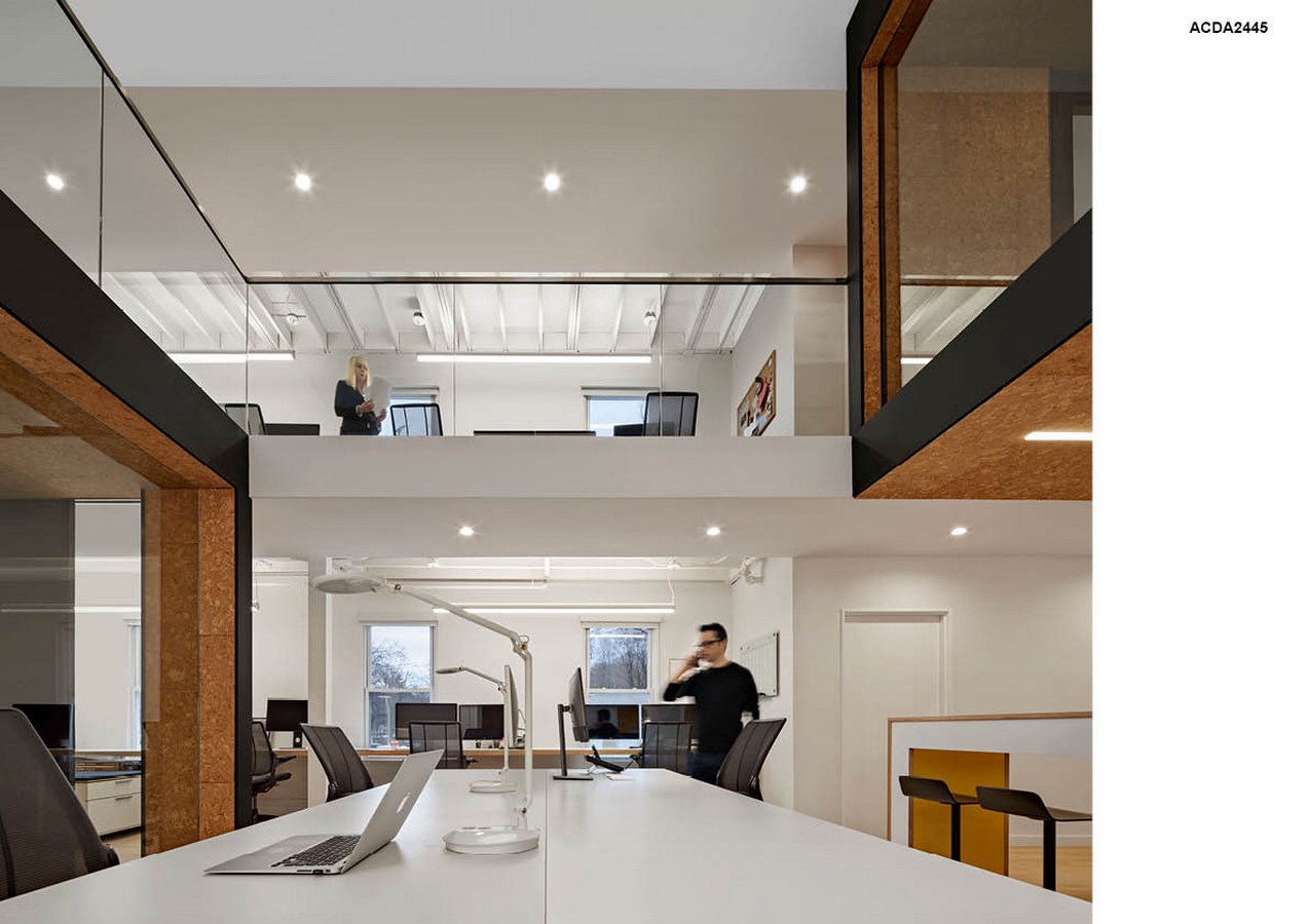A skylight-capped vertical atrium unites upper and lower work spaces and floods the building with natural light. Looking out onto this atrium are two enclosed meeting spaces, clad in cork, offering a clever application of material that is both acoustical and tackable for presenting big ideas. The meeting spaces, facing one another across the atrium, promote the cross pollination of ideas between the marketing staff on the first floor and the creative staff on the second. The outcome? “The space has energized the team. It has allowed more collaboration, more fun and more communication” says Vice President Rhodes. The 32-person team is also more efficient, because they communicate directly, rather than relying on email. He adds that having such a space helps with attracting and retaining the kind of creative workforce that is key to the group’s success. “People enjoy being here. It’s a community.” he says.