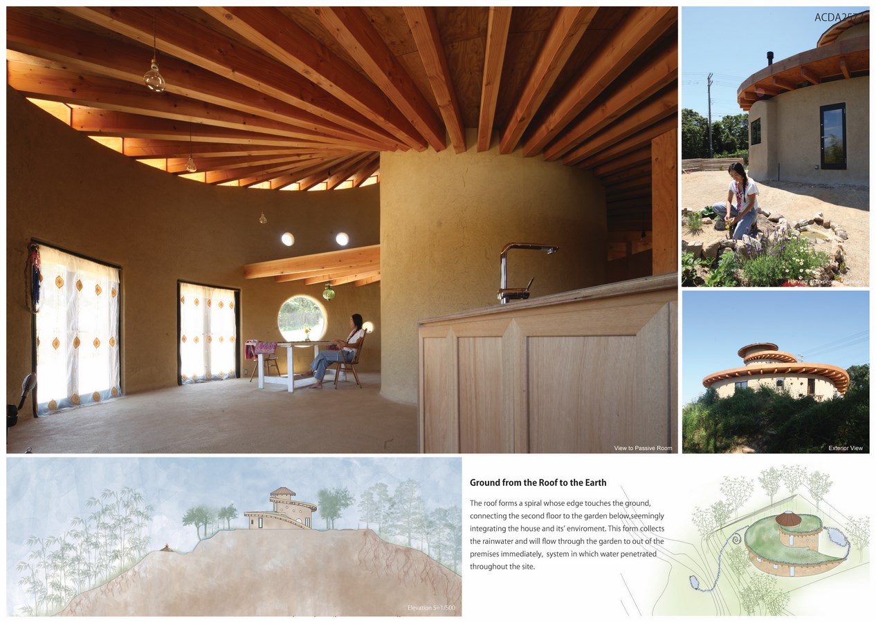 In response to its context, the house employs local timber construction. It has a unique form, consisting of a continuous spiral that rises towards the central space.