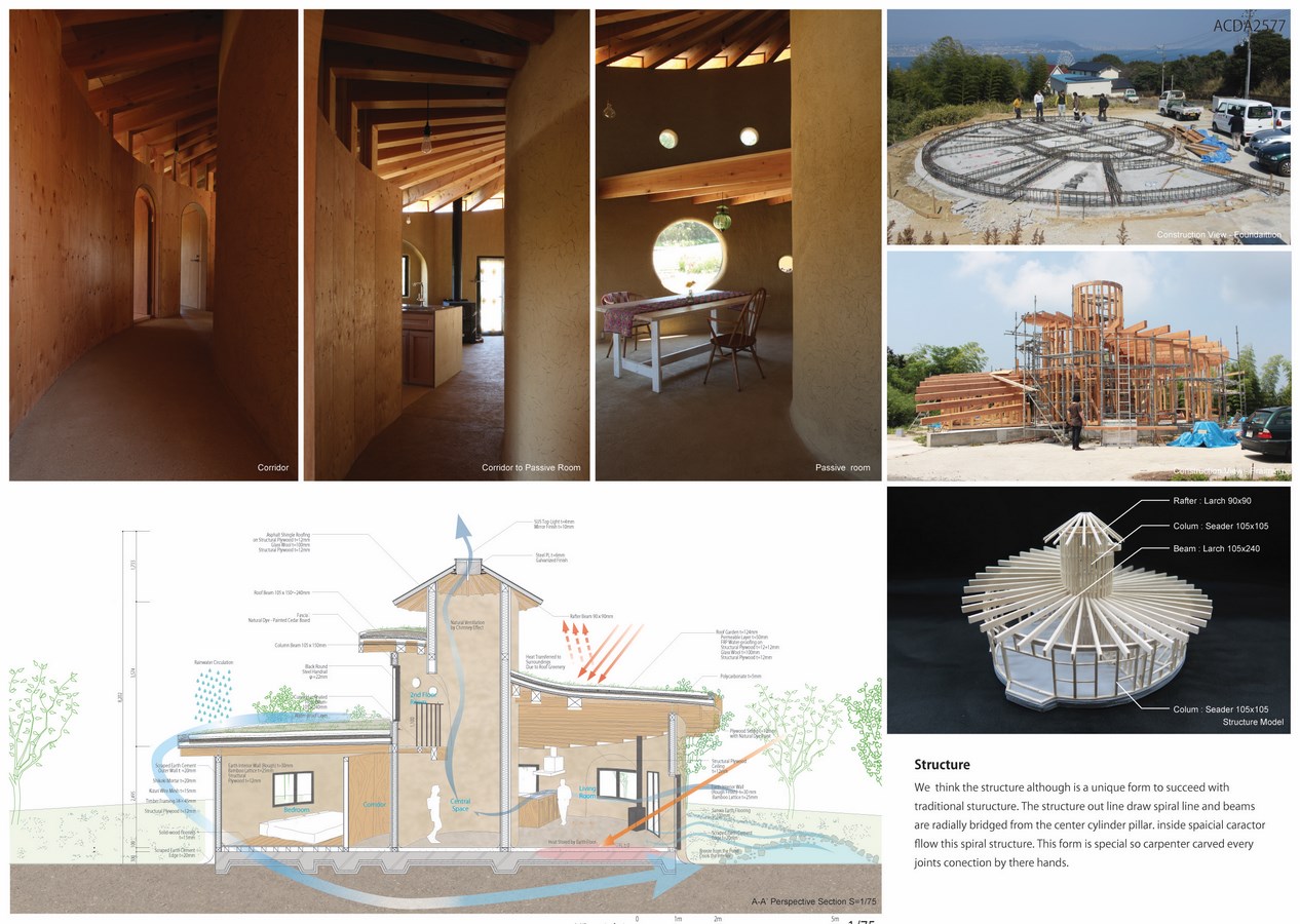 We think, the structure although is a unique form to succeed with traditional structure. The structure outline draw spiral line and beams which are radially bridged from the center cylinder pillar. This form is special, hence every joints connections are crafted by carpenter manually.
