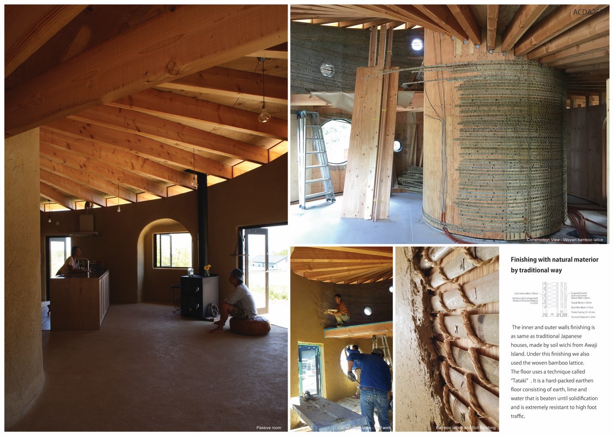 The inner and outer walls finishing is as same as traditional Japanese houses, made by soil from Awaji Island. Under this finishing we also used the woven bamboo lattice. The floor uses a technique called “Tataki”. It is a hard-packed earthen floor comprising of earth, lime and water that is beaten until solidification and is extremely resistant to high foot traffic.