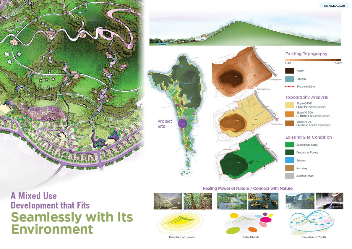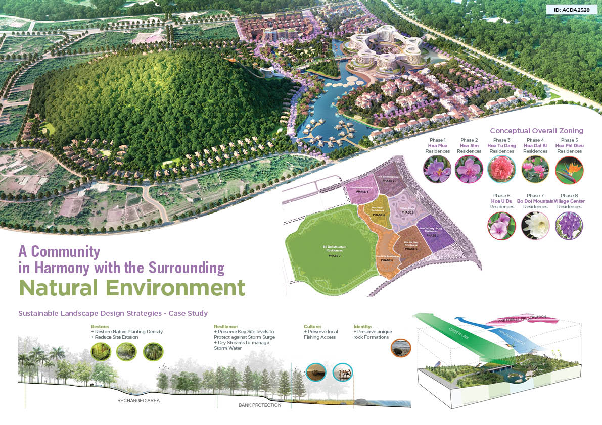 Visioning to create an adaptive development in response to the unique natural qualities and features of site, the internal main traffic system will adapt to the natural topography of the site, while the character zones and building typologies are inspired by the local indigenous flowers carefully chosen to define each cluster character. In particular, the elegant Melastoma flower with its essence of beauty and healing power was the main inspiration for the development. The diverse and plentiful landscape of surrounding area with mountains, forests, cashew orchards, pepper farms, fruit gardens and streams flowing through the land forms spectacular vistas for the development. The plan utilizes low-lying terrain in the west to create a large landscape lake company with new types of water bungalows, lakeview villas, and a floating wellness and healing service centre in the lagoon. The whole greenery park in the residential areas is retained and upgraded from the existing forest ecosystem to create a calm and relaxing living environment.