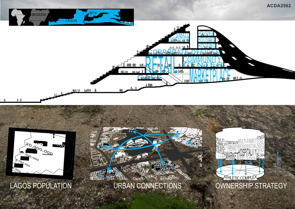 This proposal re-imagines the form, function, and funding of the stadium typology to ensure its vitality while activating an underutilized parcel in a developing metropolis. The former Olusosun Landfill in Lagos Nigeria offers an open site for development within one of the world’s fastest growing cities, a city which has historically struggled to maintain a world class stadium despite public demand.