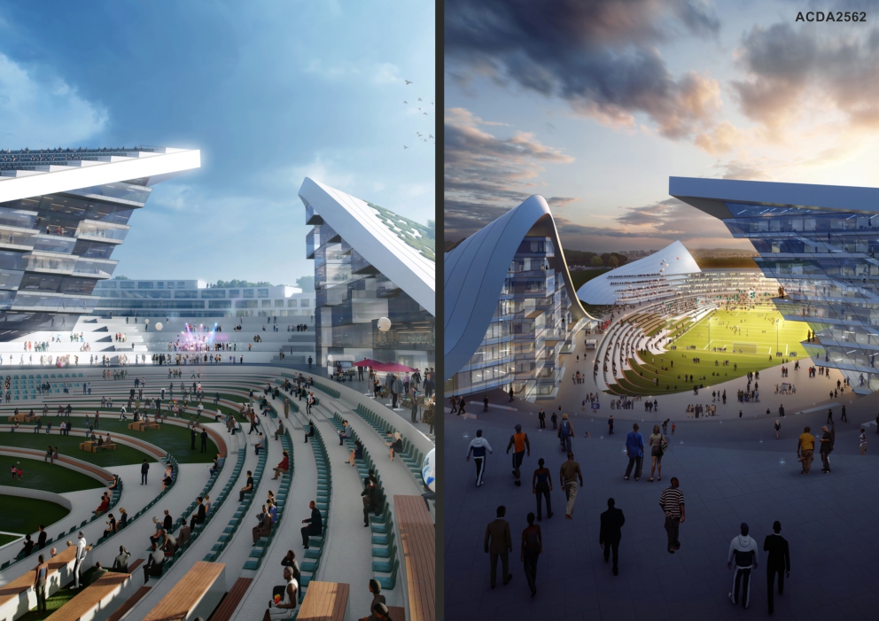 The stadium is organized around the central athletic field with various programs encircling it along a continuous concourse. Intended to be a porous public space, the line between stadium, mixed use center, and public park are entirely dissolved. The result is a collection of programs which operate independently from the athletic functions while also engaging with them. During both the day and night, those who work, eat, live and play in the area are invited to permeate through the space regardless of whether or not there is a team on the field. Stadium seating doubles as park space with enlarged terraces to accommodate outdoor recreation, while rooflines and cantilevered vistas enable up to forty thousand spectators to enjoy an event.