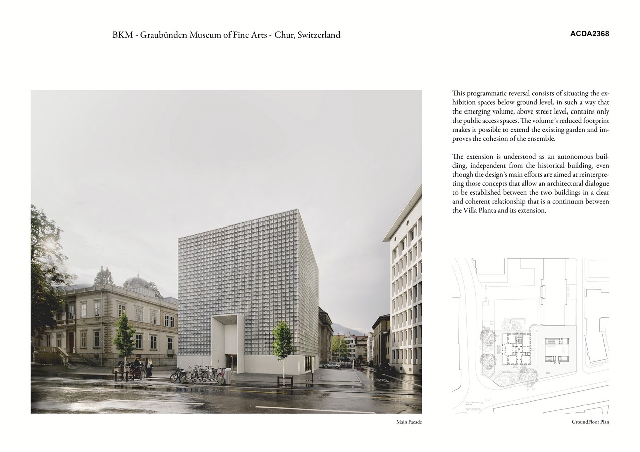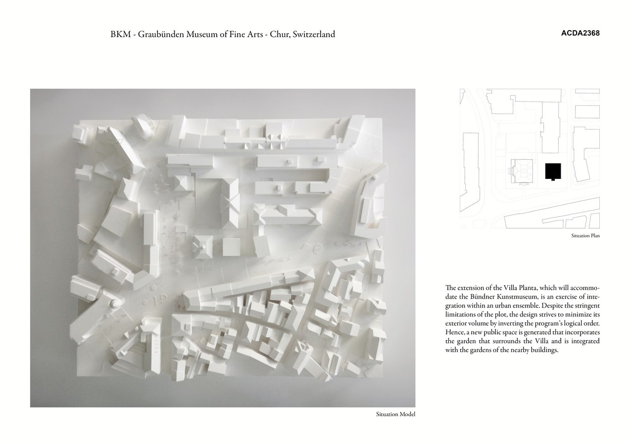 The extension of Villa Planta, which will accommodate the Bündner Kunstmuseum, is an exercise in integration within an urban ensemble. Despite the stringent limitations of the plot, the design strives to minimize its exterior volume by inverting the programme’s order.