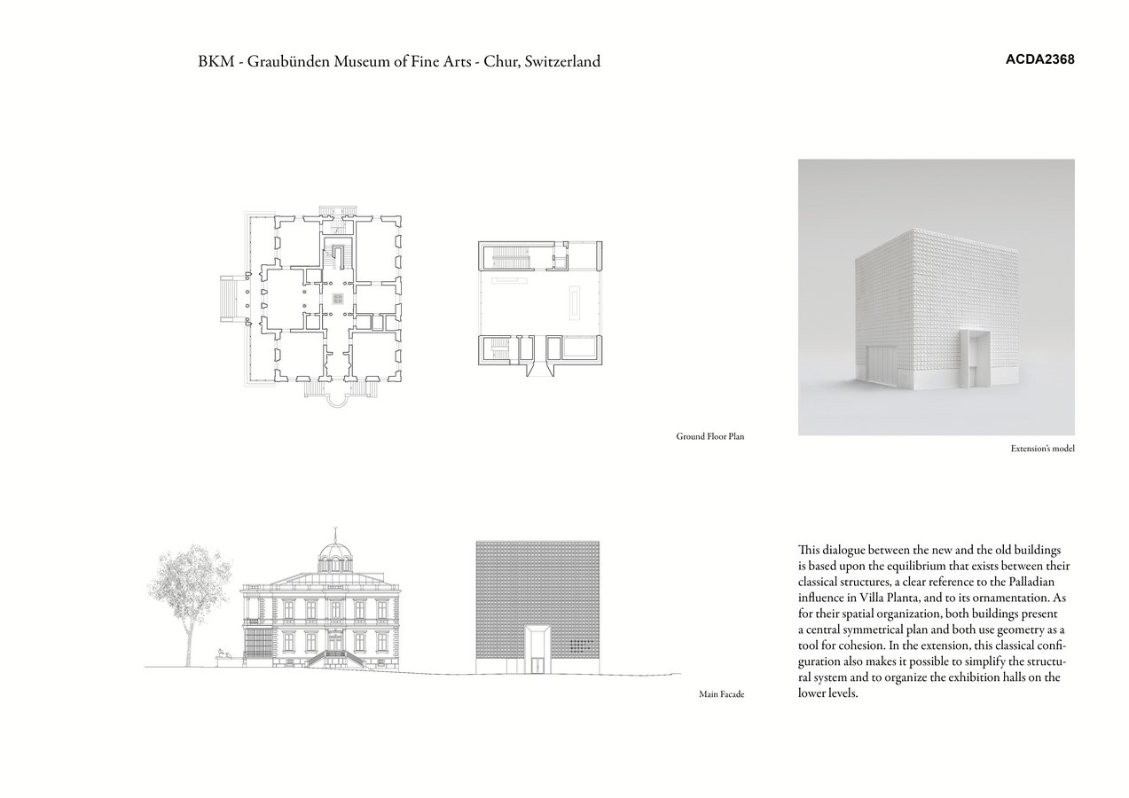 This dialogue between the new and old buildings is based upon the balance that exists between their classical structures, a clear reference to the Palladian influence in Villa Planta, and to its ornamentation. As for their spatial organization, both buildings present a central symmetrical plan and both use geometry as a tool for cohesion. In the extension, this classical configuration also makes it possible to simplify the structural system and to organize the exhibition halls on the lower levels.