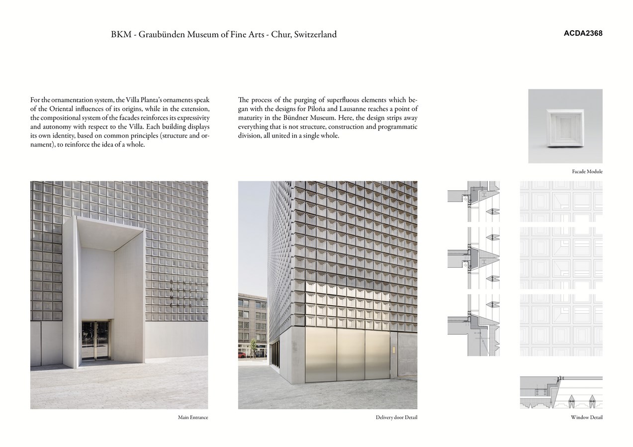 Villa Planta’s ornaments speak of the Oriental influences of its origins, while in the extension, the compositional system of the facades reinforces its expressivity and autonomy with respect to the Villa. Each building displays its own identity, based on common principles (structure and ornament) to reinforce the idea of a whole.