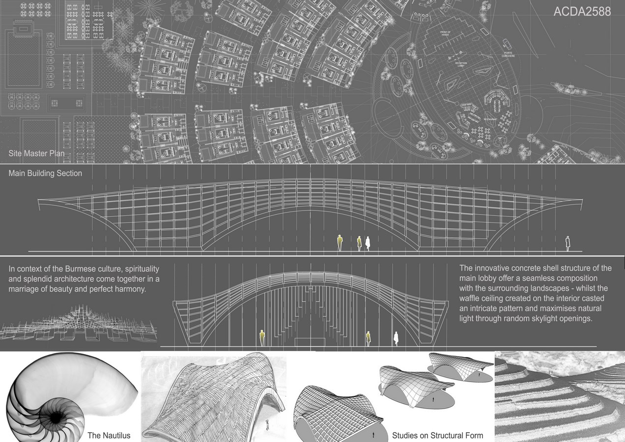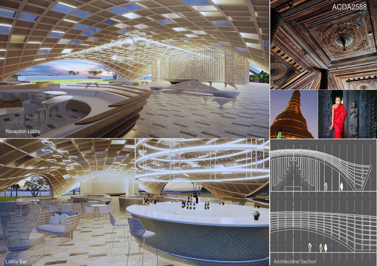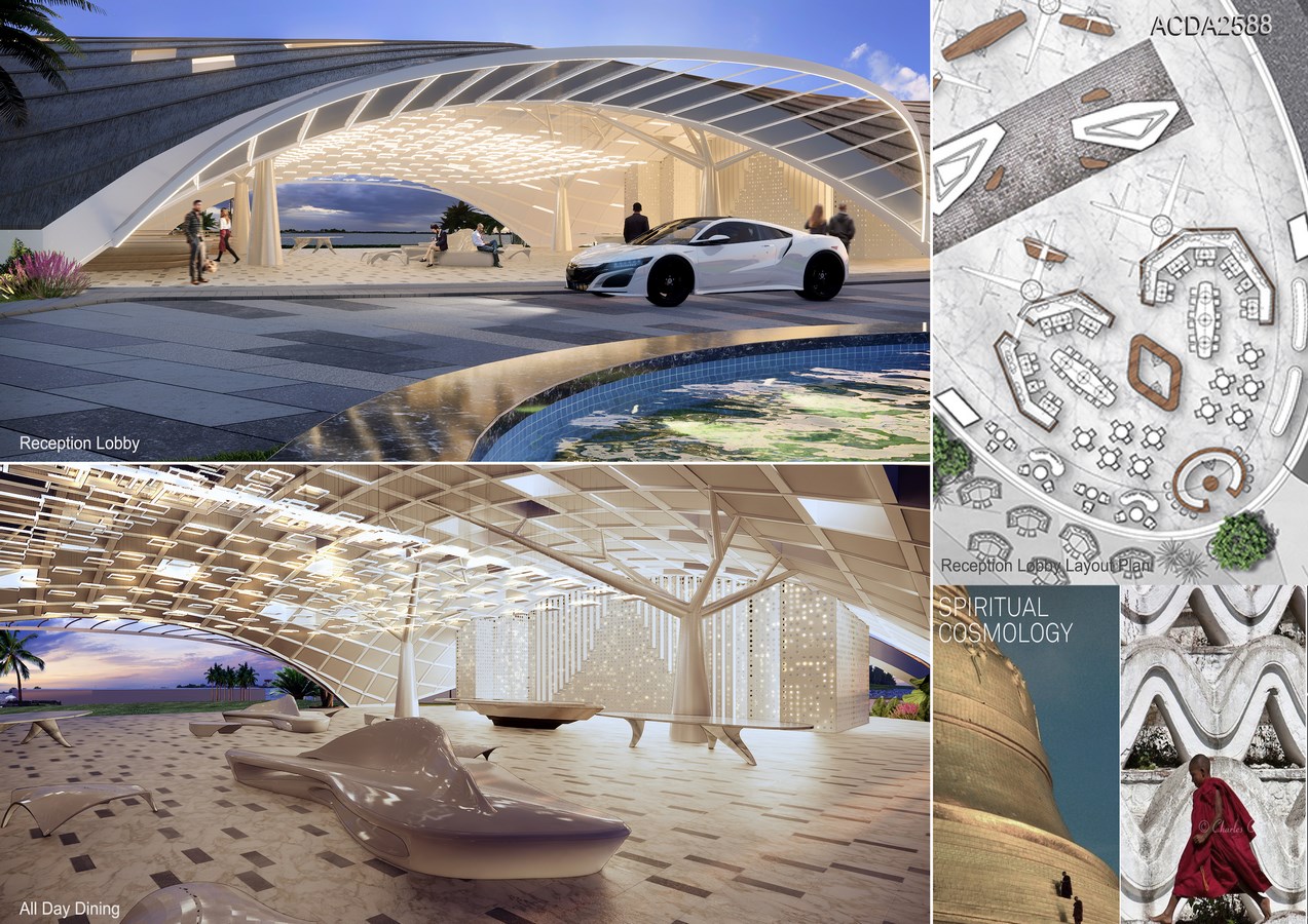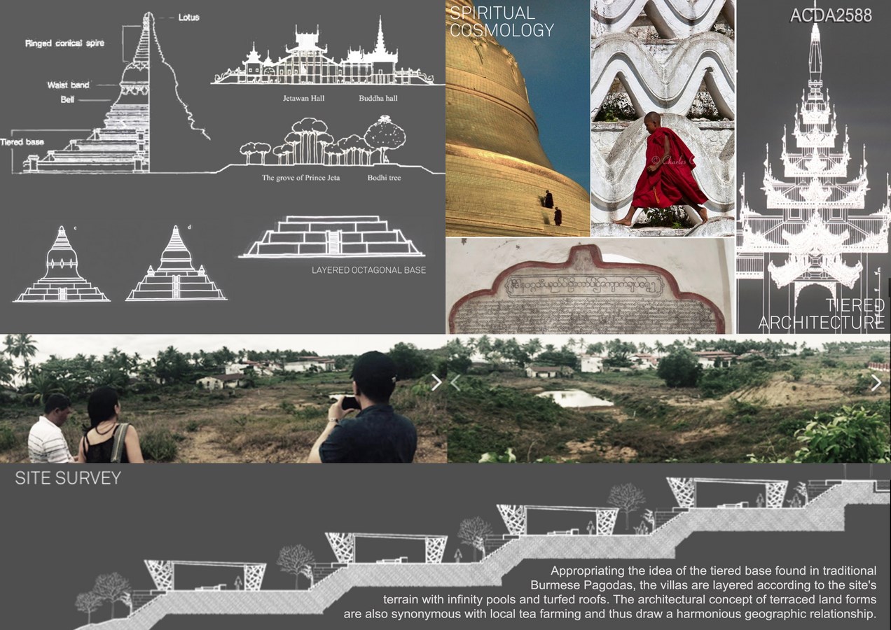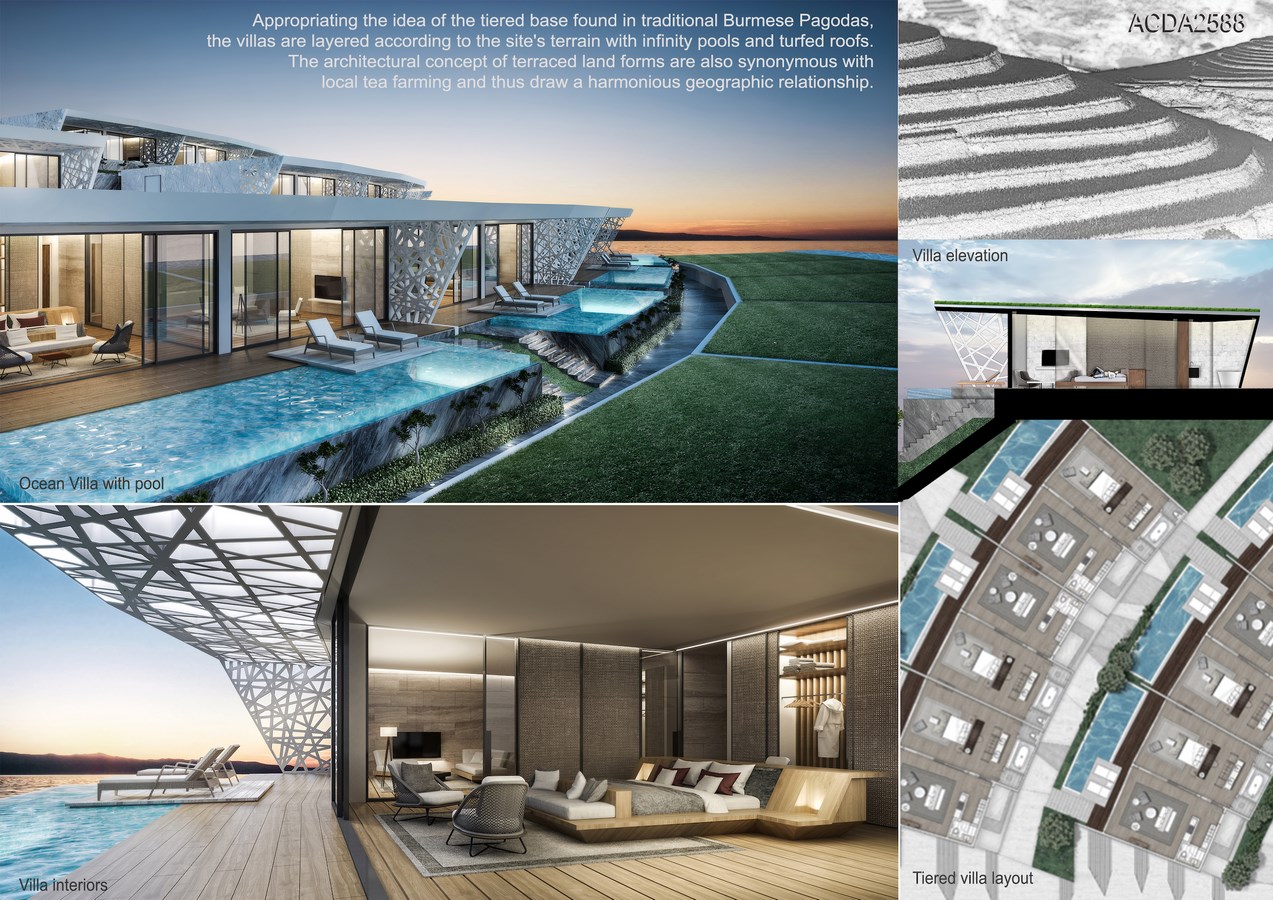 Appropriating the idea of the tiered base found in traditional Burmese Pagodas, the villas are layered to the site’s terrain with infinity pools and turfed roofs. The architectural concept of terraced land forms are also synonymous with local tea farming and thus draw a harmonious geographic relationship.
