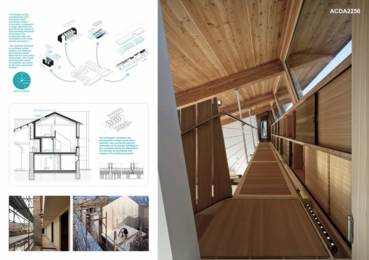 From a construction standpoint, the intervention was approached with an innovative spirit, using the development of light, prefabricated construction methods which allowed the project to be concluded in a limited time frame. The design process resembled that of an industrial product and defined various construction components in wood, steel and stone built off-site by a group of local industrial companies and artisans. The components were then assembled on-site using tectonic connectors.